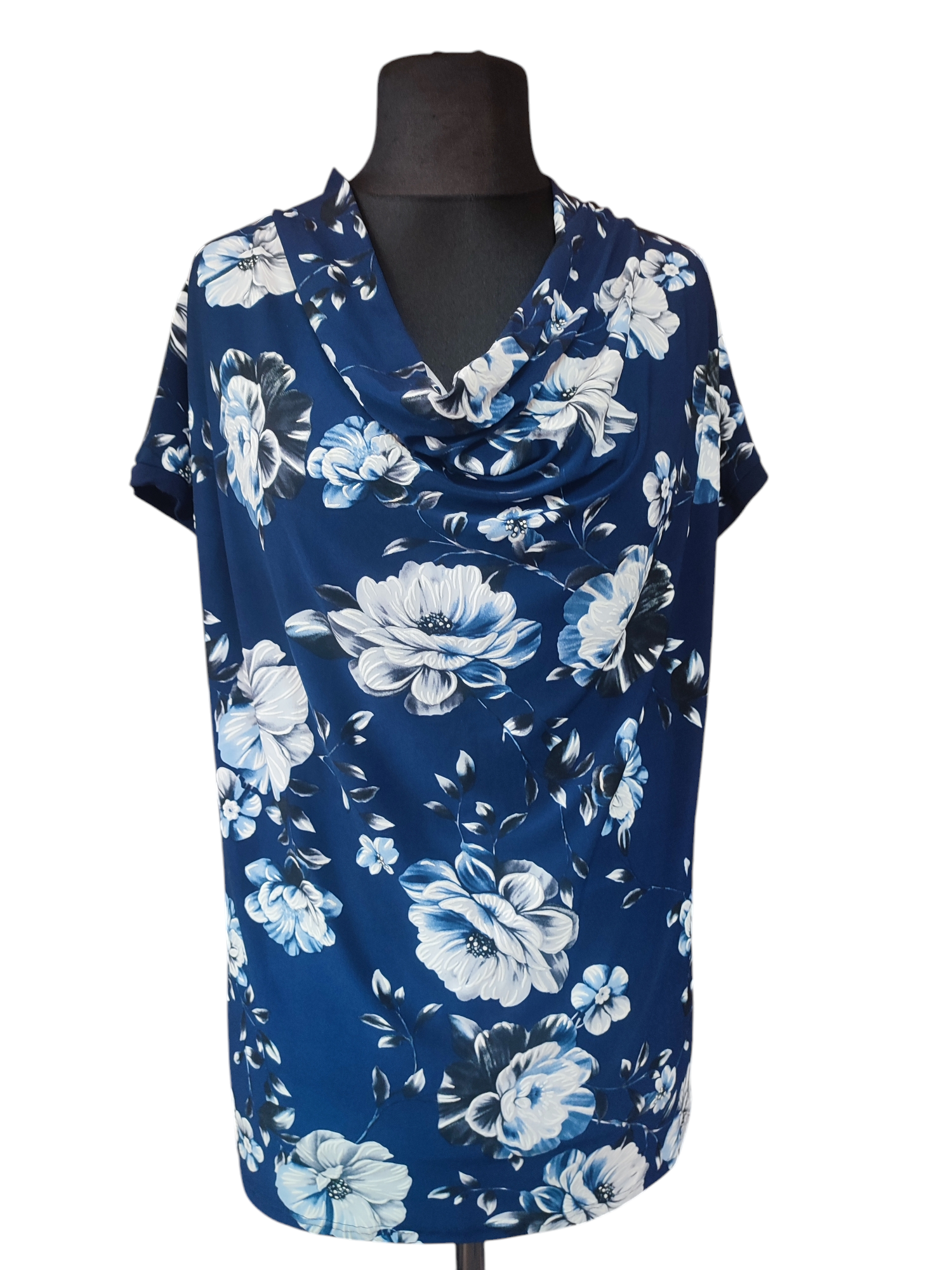 Luźna kolorowa bluzeczka z mocno lejącym dekoltem typu woda i krótkim rękawkiem kimono. Na dole prosta zakończona podwinięciem. Przepiękny wzór ogrodowych kwiatów przypomina wiosnę, mieni się barwami bieli i błękitu na granatowym tle. Bluzeczka pasuje zarówno do spodni i do spódnicy. Świetnie komponuje się z klasycznym żakietem czy swetrem w jednolitym kolorze. Bluzka ma długość do bioder, dzięki temu możesz ją nosić luźno, przewiązać paskiem lub wciągnąć w spódnicę.
