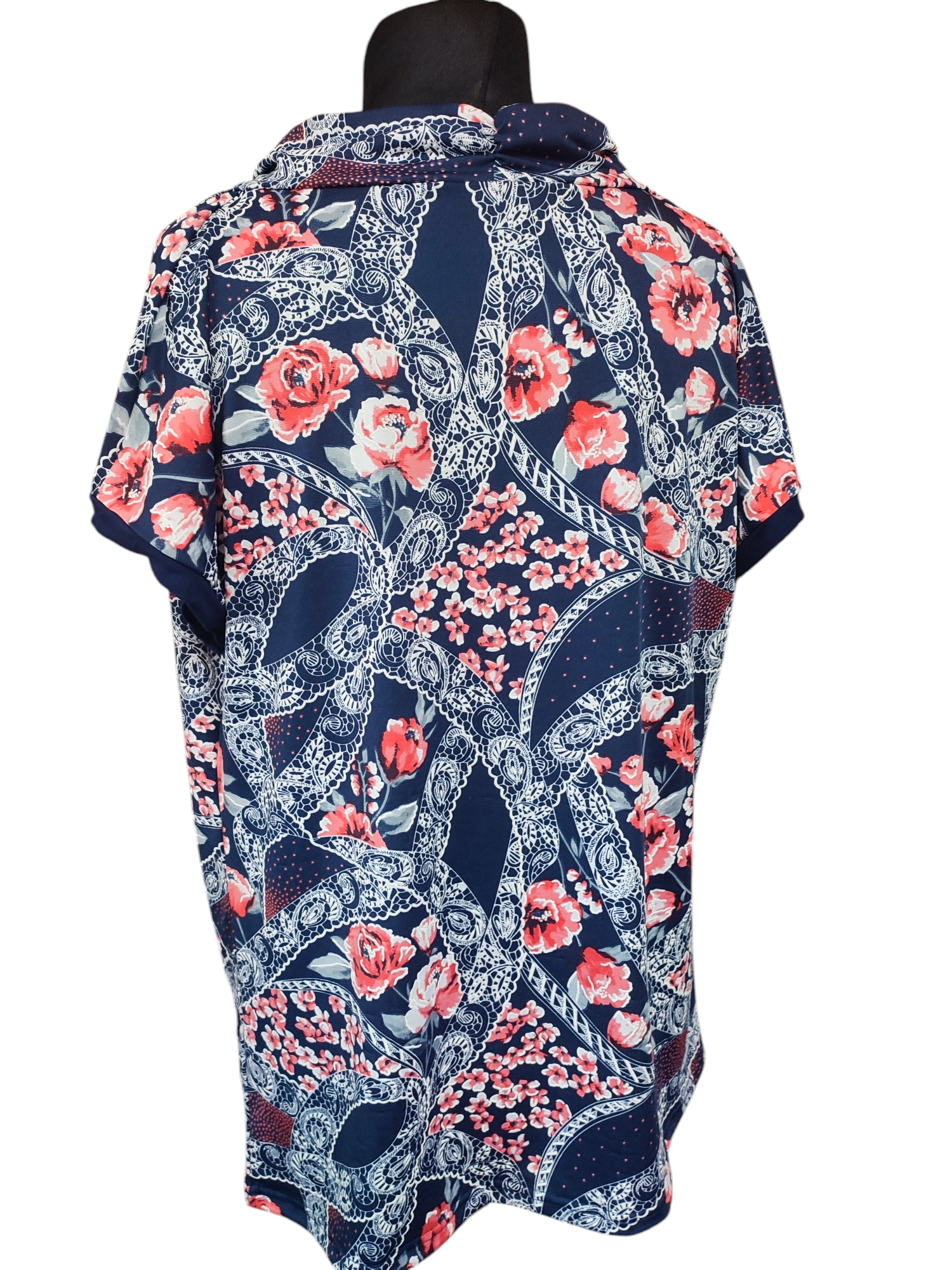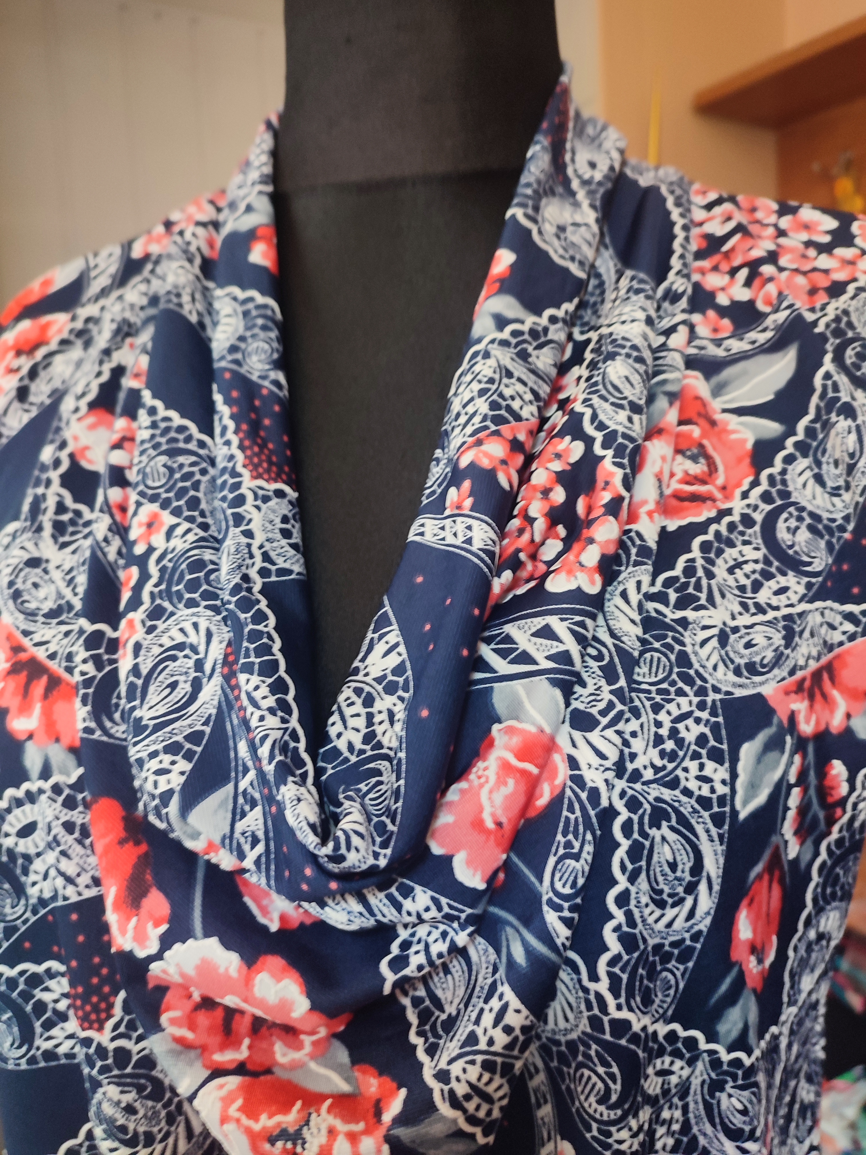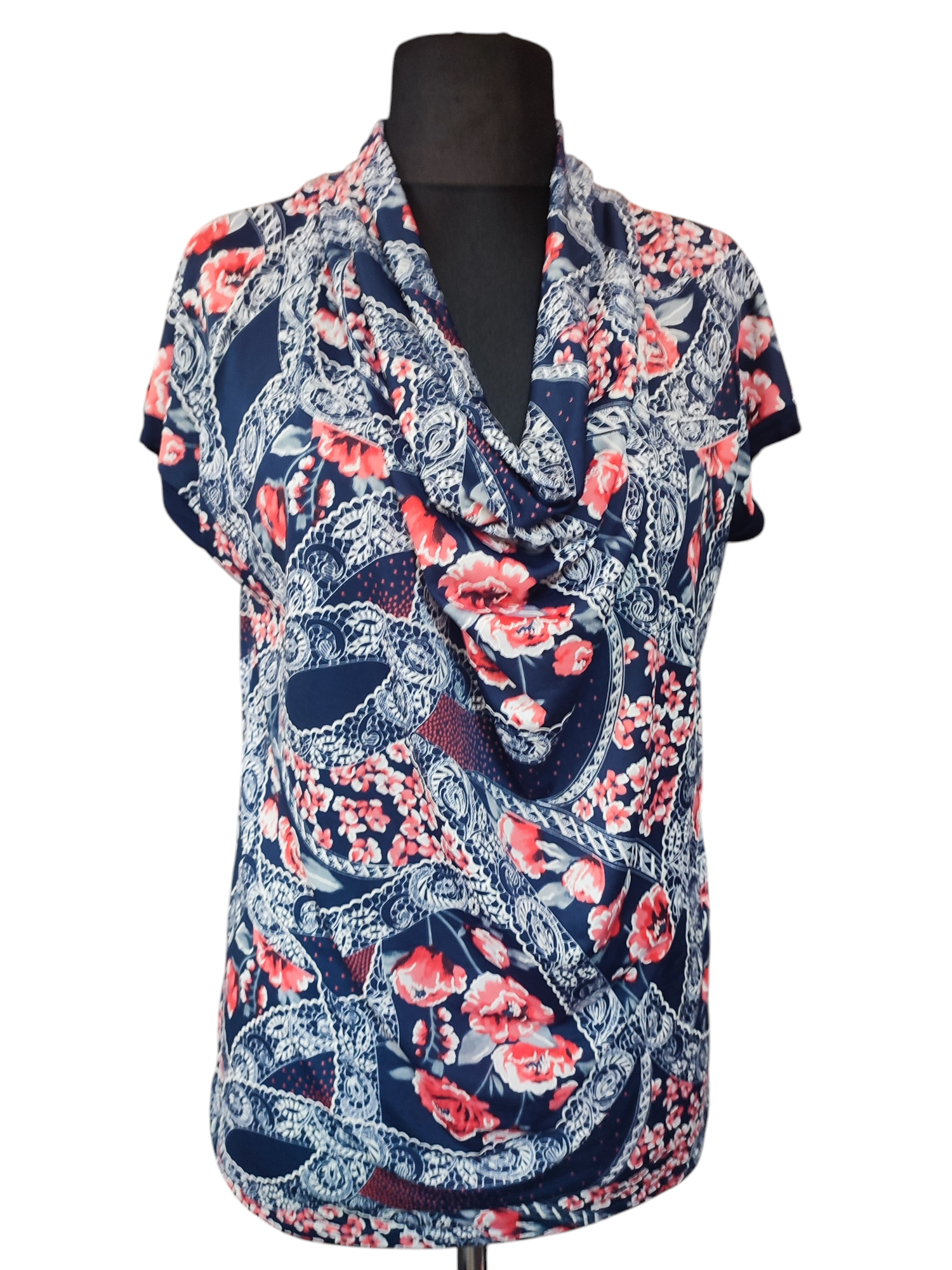 Luźna kolorowa bluzeczka z mocno lejącym dekoltem typu woda i krótkim rękawkiem kimono. Na dole prosta zakończona tylko podwinięciem. Przepiękny, delikatny wzór kwiatowy który wygląda jak namalowany ręką artysty, biały wzór przypominający koronkę przeplatany malinowymi kwiatami na granatowym tle. Bluzeczka pasuje zarówno do spodni i do spódnicy. Świetnie komponuje się z klasycznym żakietem czy swetrem w jednolitym kolorze. Bluzka ma długość do bioder, dzięki temu możesz ją nosić luźno, przewiązać paskiem lub wciągnąć w spódnicę.