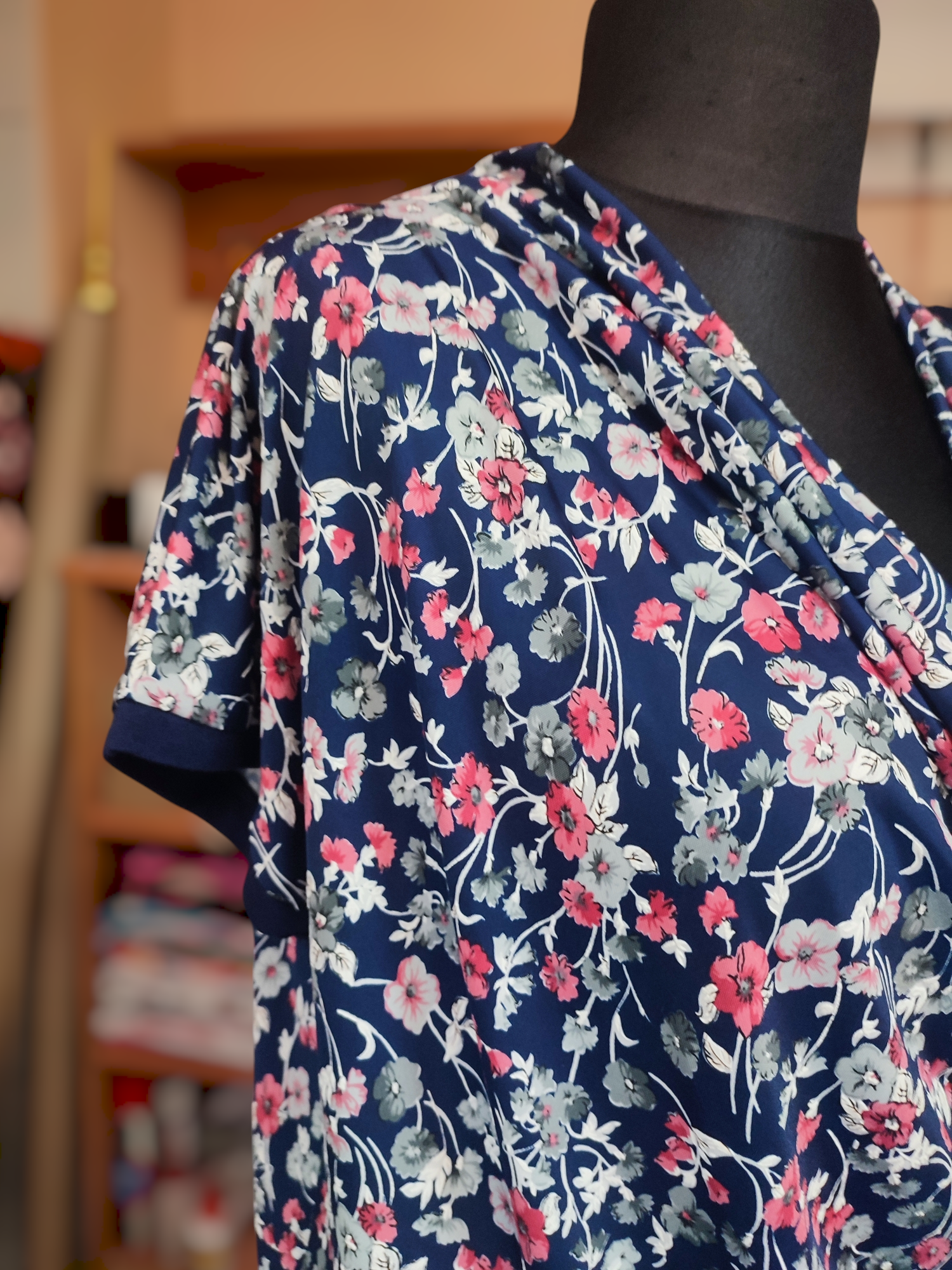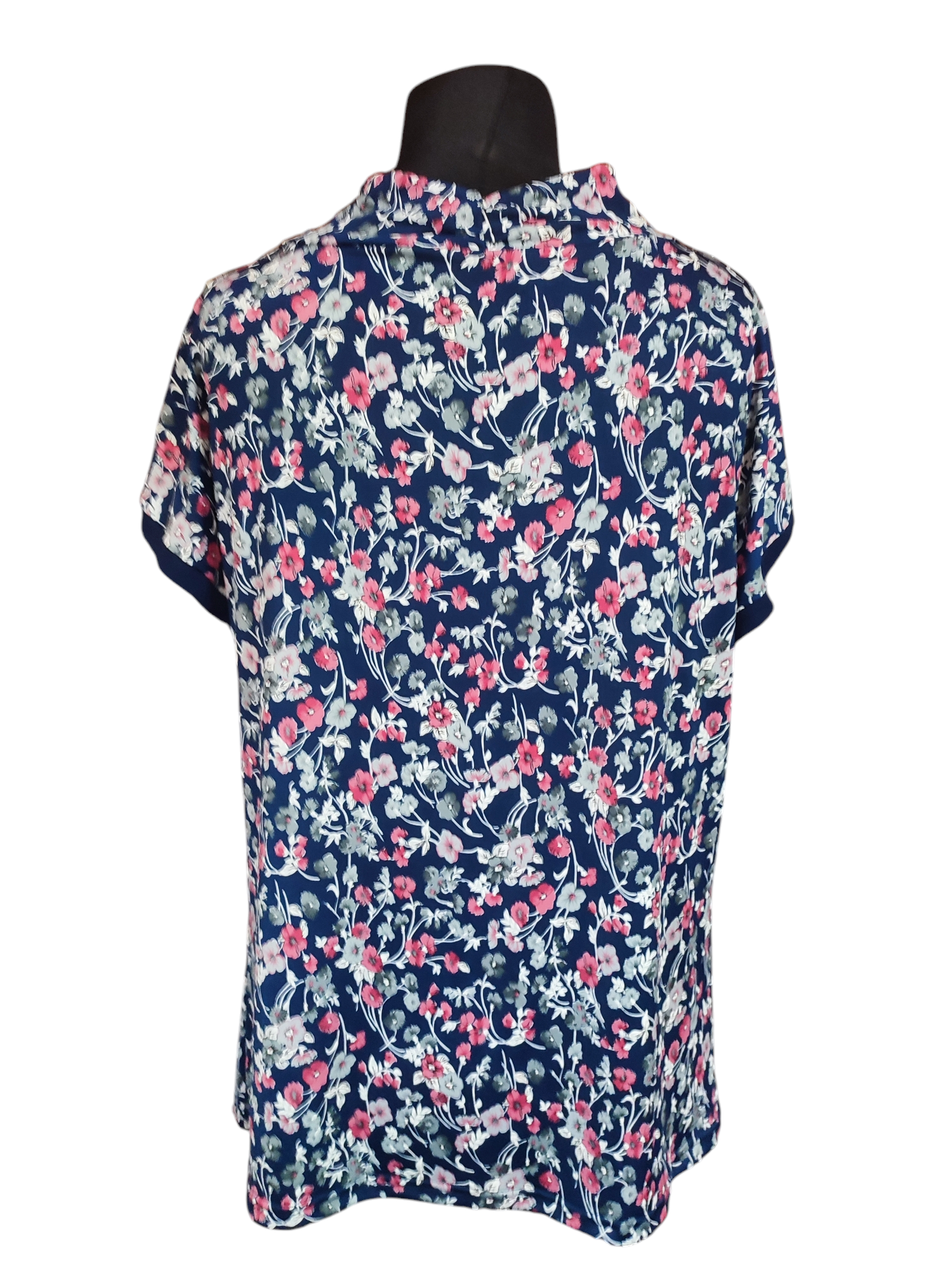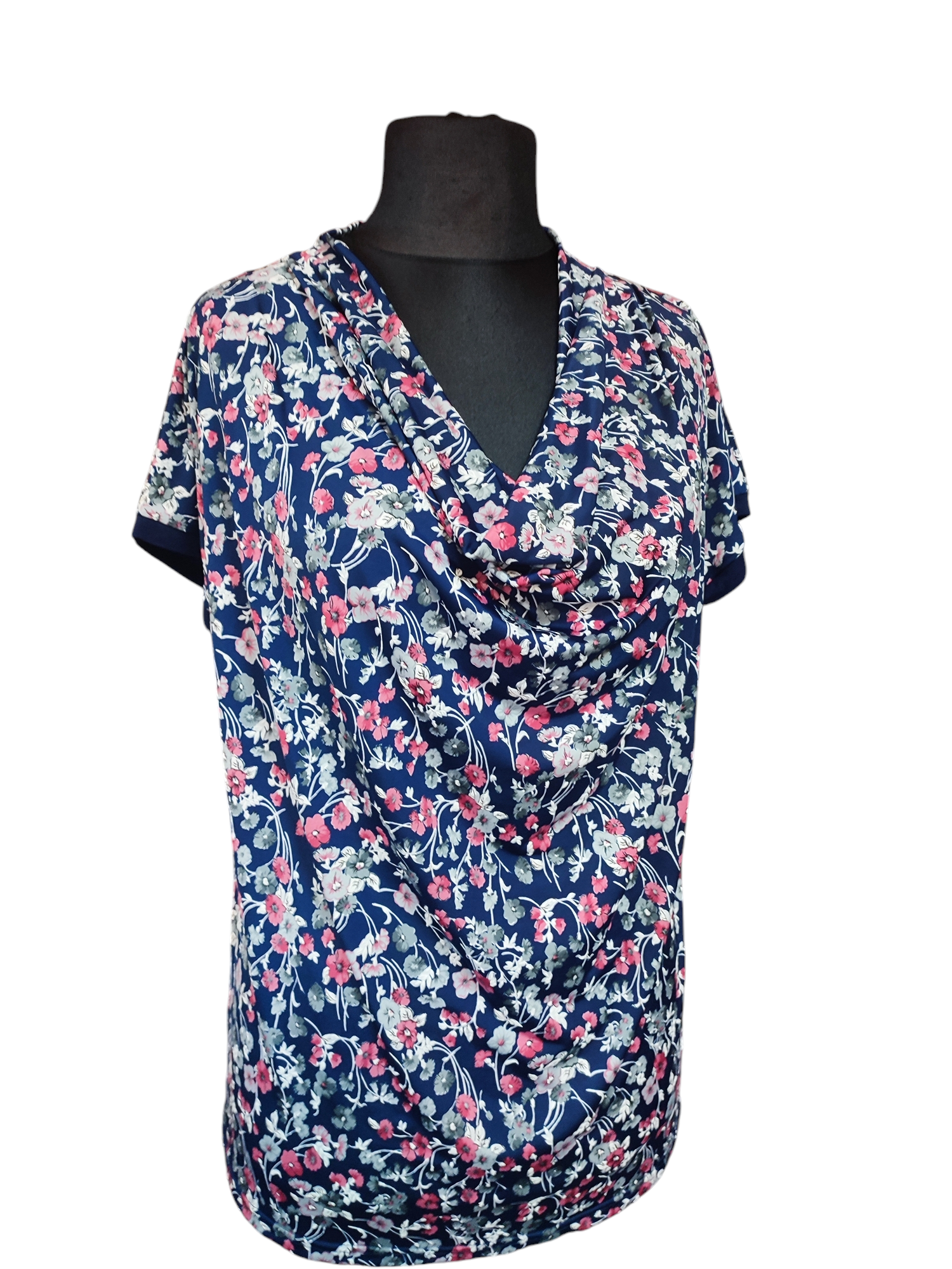 Luźna kolorowa bluzeczka z mocno lejącym dekoltem typu woda i krótkim rękawkiem kimono. Na dole prosta zakończona tylko podwinięciem. Przepiękny, delikatny wzór zdobiony gęsto malinowymi i szarymi kwiatkami na granatowym tle. Bluzeczka pasuje zarówno do spodni i do spódnicy. Świetnie komponuje się z klasycznym żakietem czy swetrem w jednolitym kolorze. Bluzka ma długość do bioder, dzięki temu możesz ją nosić luźno, przewiązać paskiem lub wciągnąć w spódnicę.