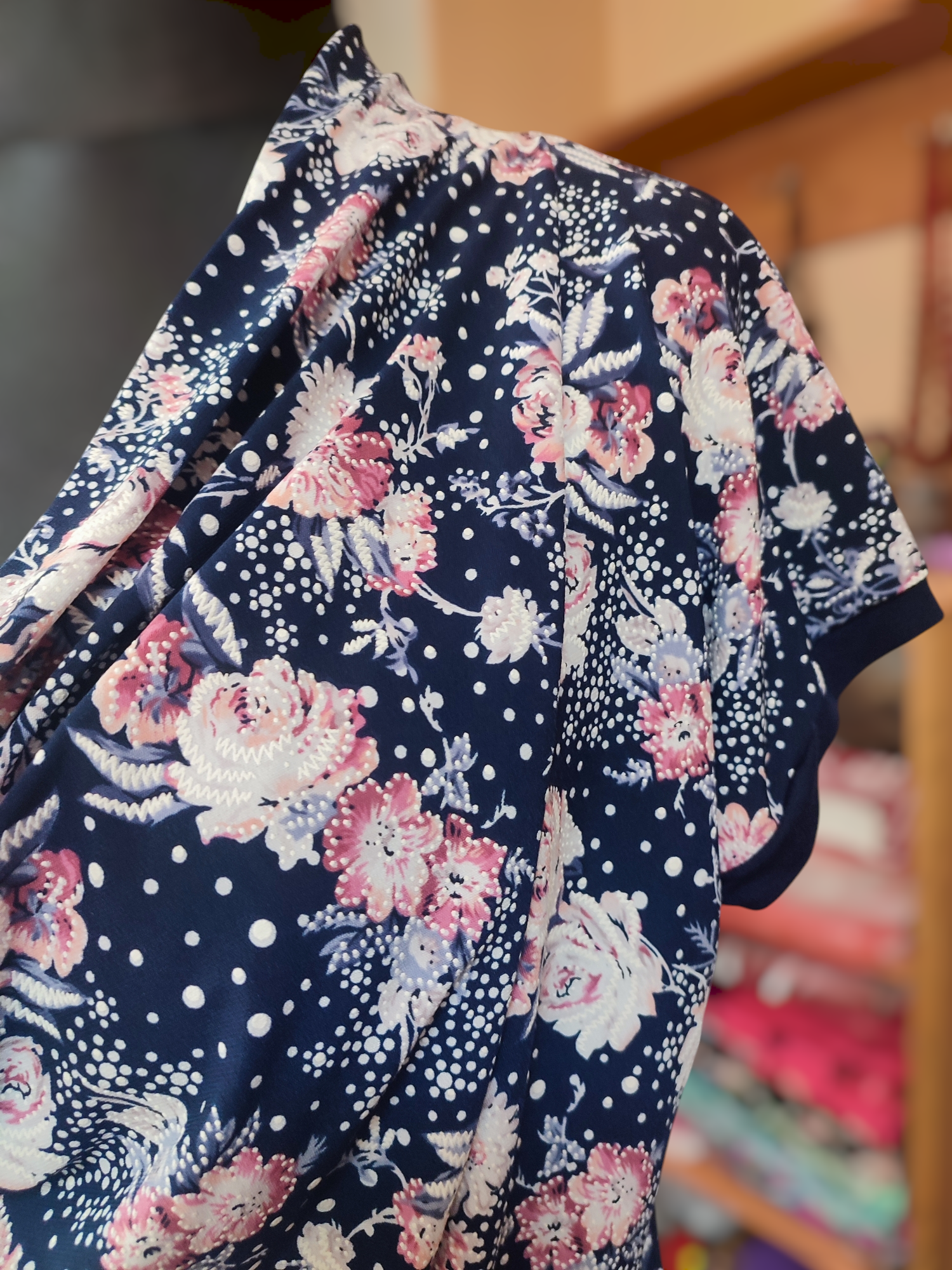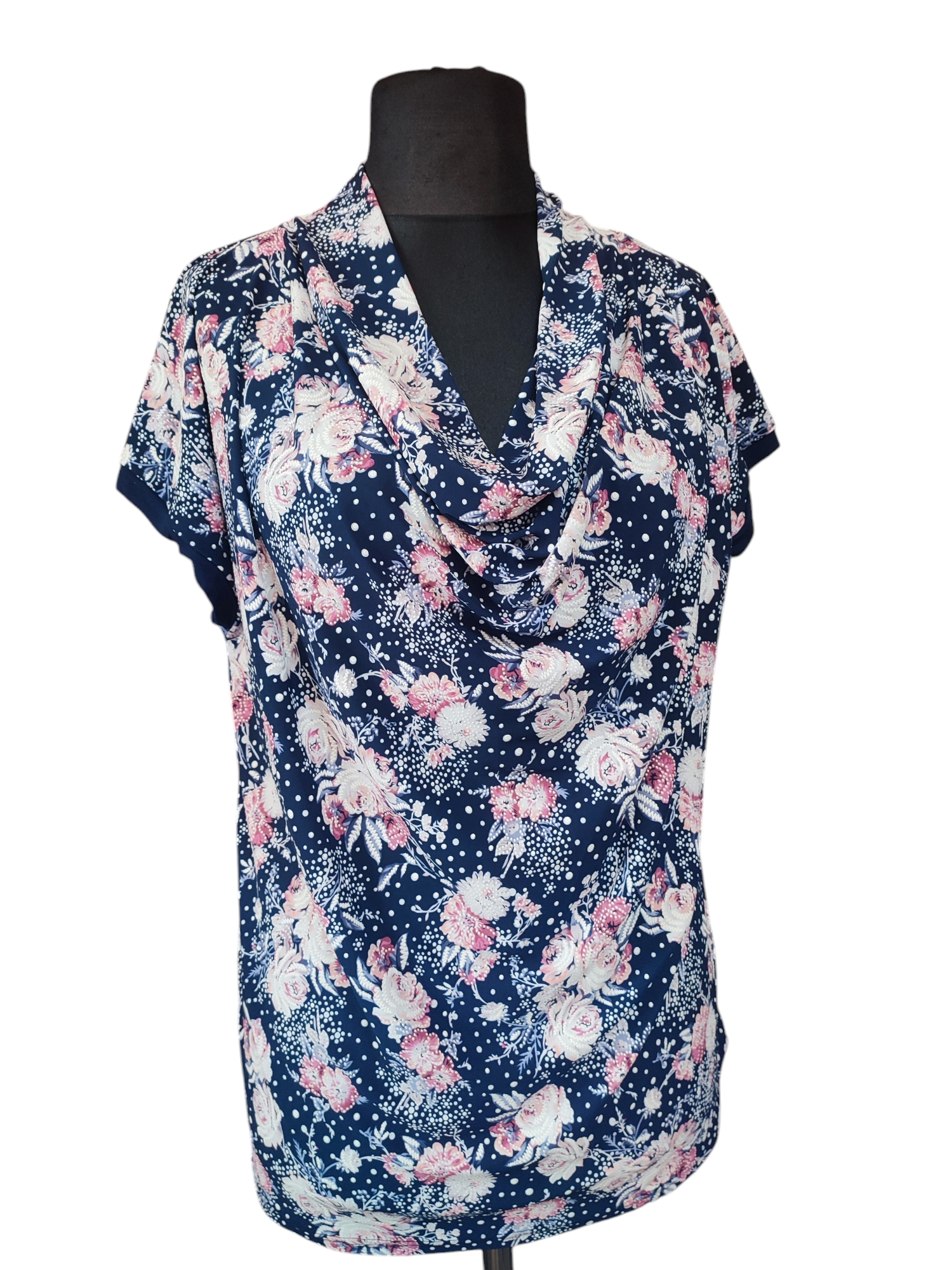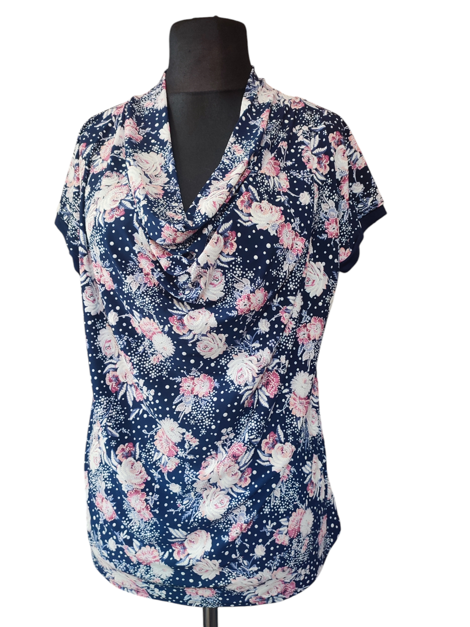 Luźna kolorowa bluzeczka z mocno lejącym dekoltem typu woda i krótkim rękawkiem kimono. Na dole prosta zakończona podwinięciem. Przepiękny, delikatny wzór drobnych różowych kwiatuszków zdobiony gęsto białymi groszkami czy koralikami na granatowym tle. Bluzeczka pasuje zarówno do spodni i do spódnicy. Świetnie komponuje się z klasycznym żakietem czy swetrem w jednolitym kolorze. Bluzka ma długość do bioder, dzięki temu możesz ją nosić luźno, przewiązać paskiem lub wciągnąć w spódnicę.