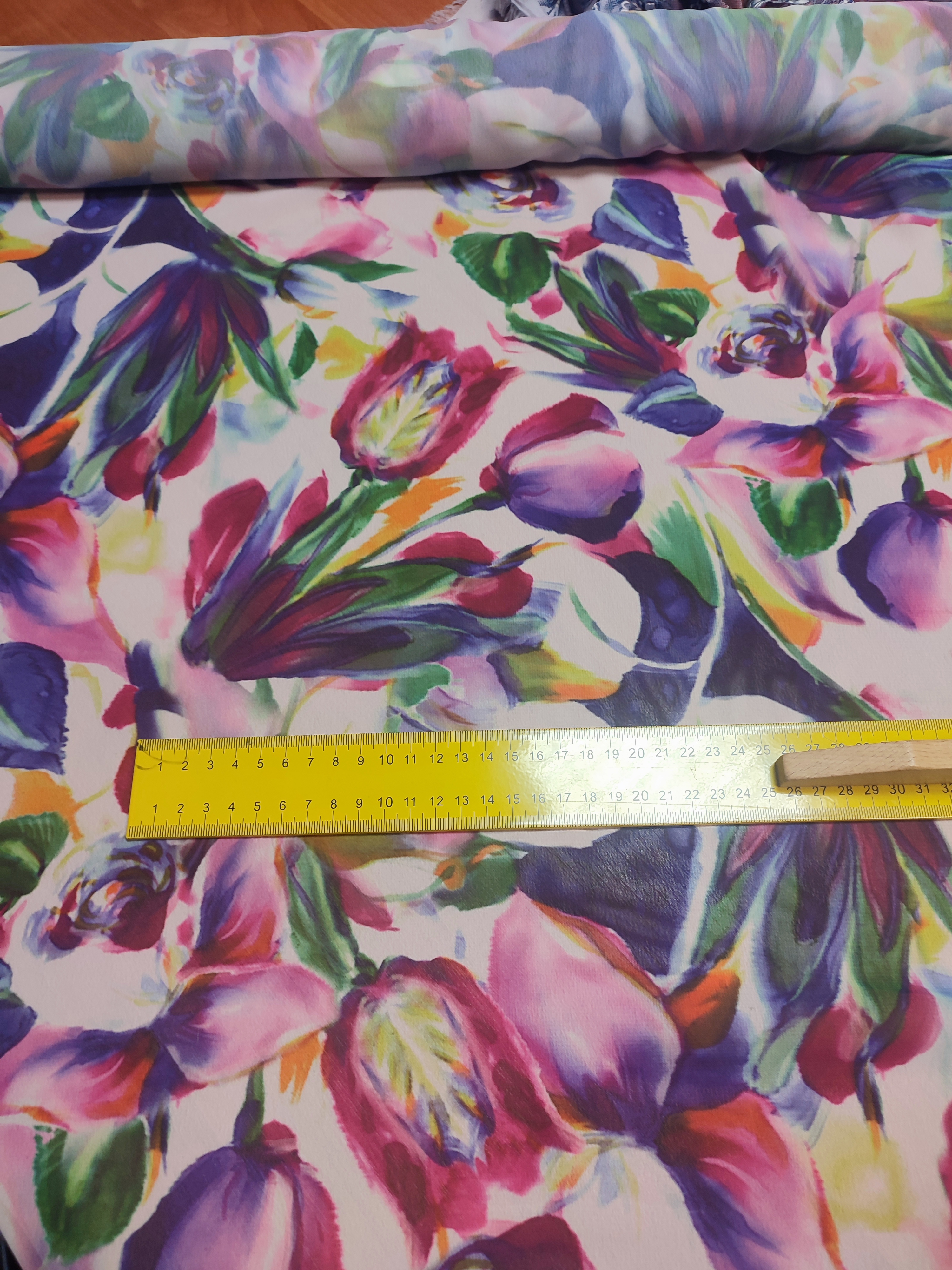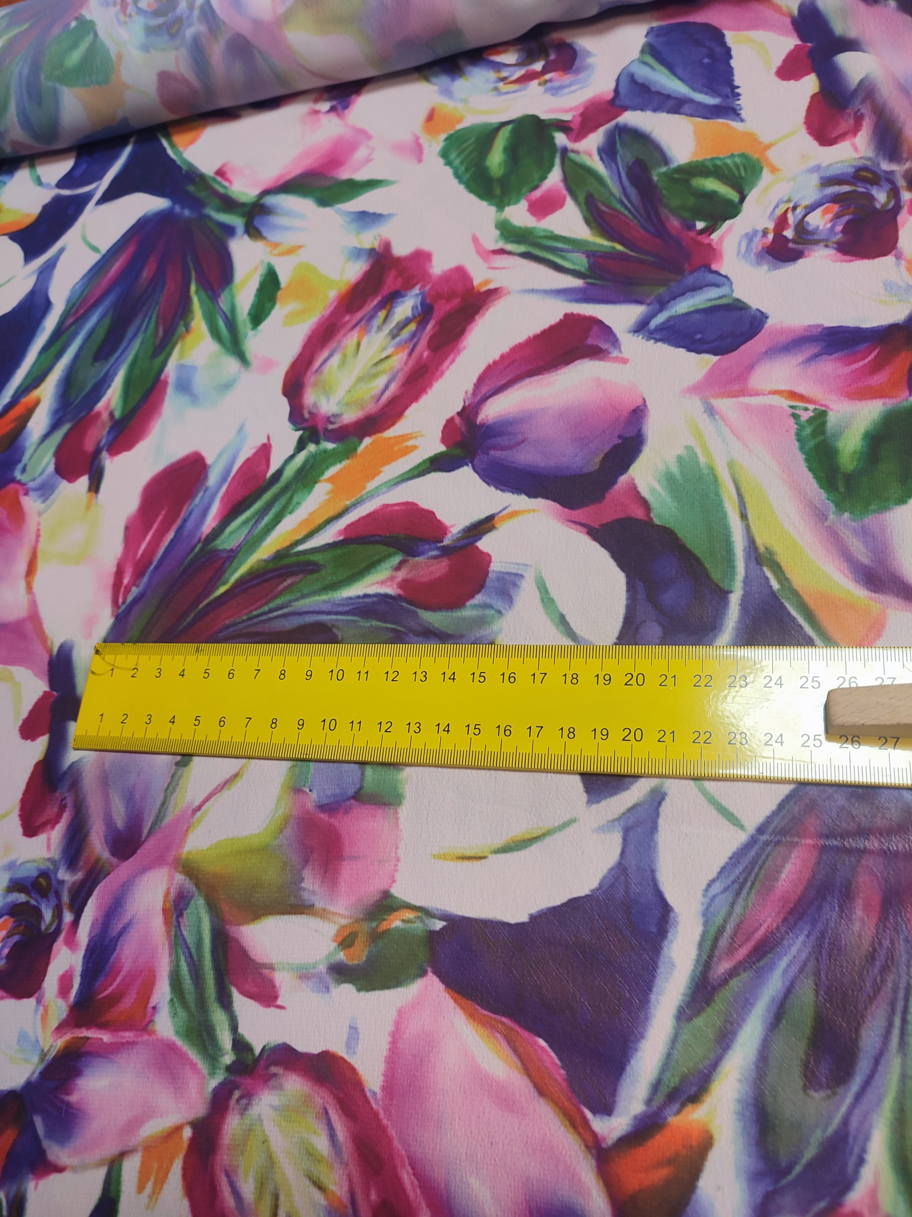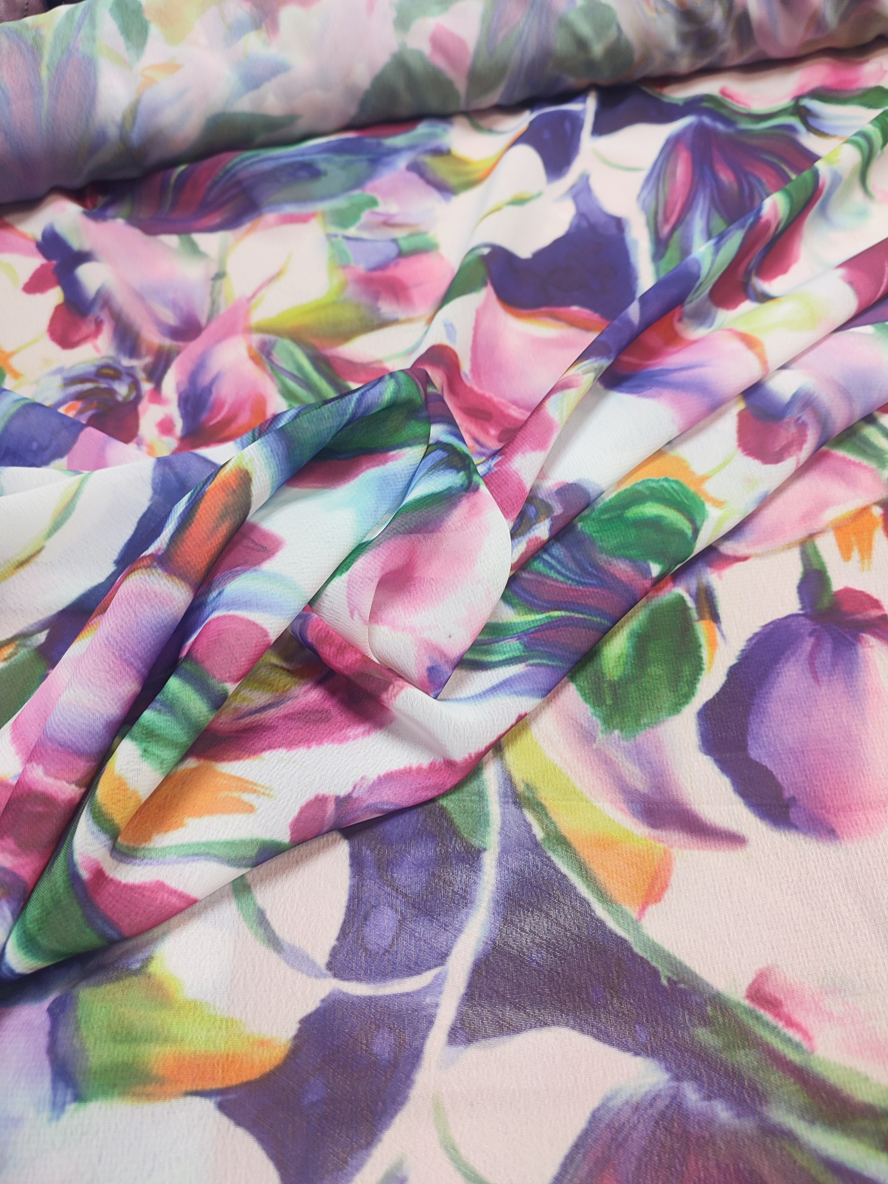 Delikatna cienka tkanina szyfon - wzór w kolorowe tulipanyDelikatna cienka tkanina szyfon - wzór w kolorowe tulipanyDelikatna cienka tkanina szyfon - wzór w kolorowe tulipany