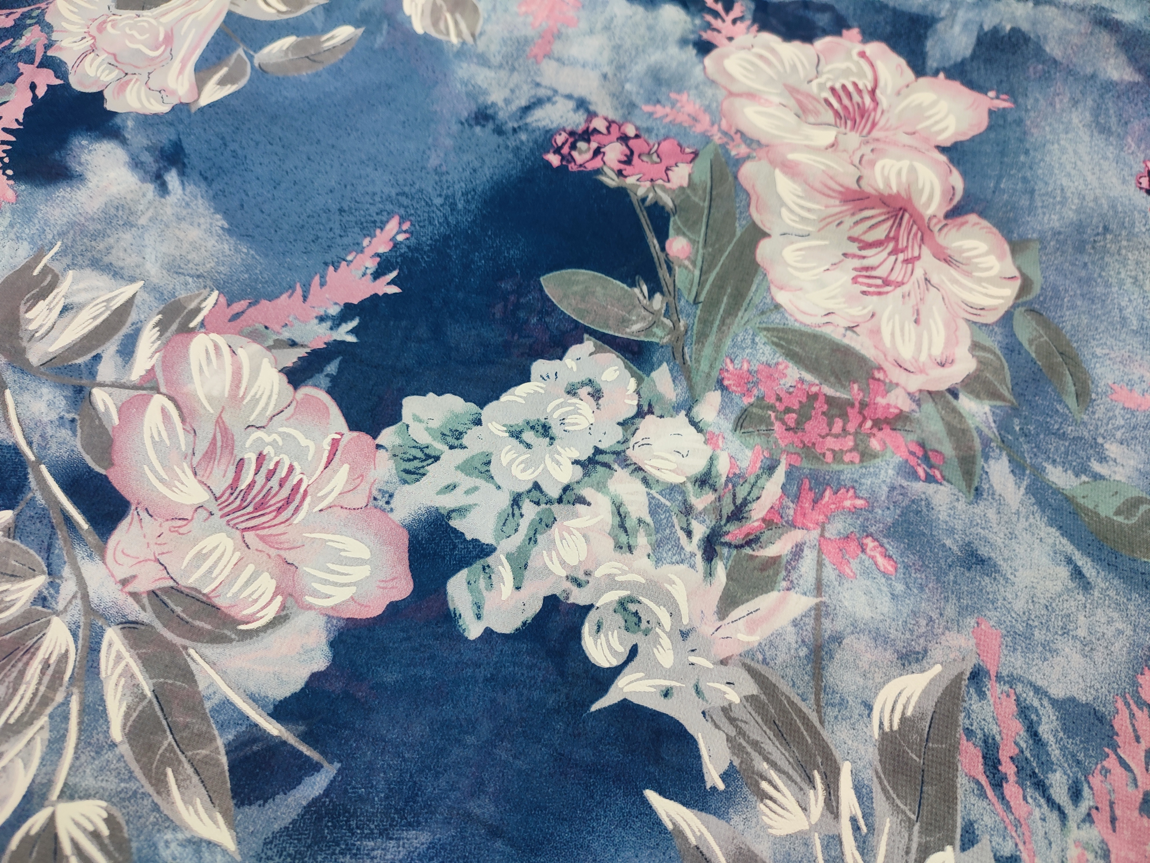 Strona główna » Tkaniny » Elastyczna niebieska dzianina Jersey z białymi kwiatami