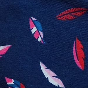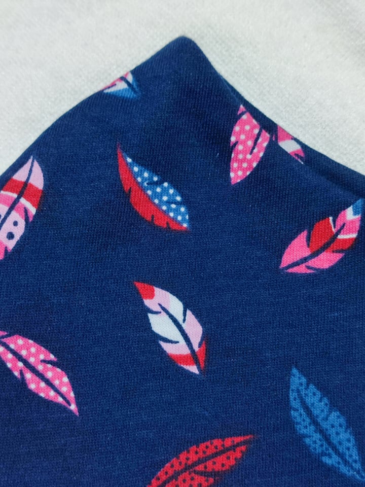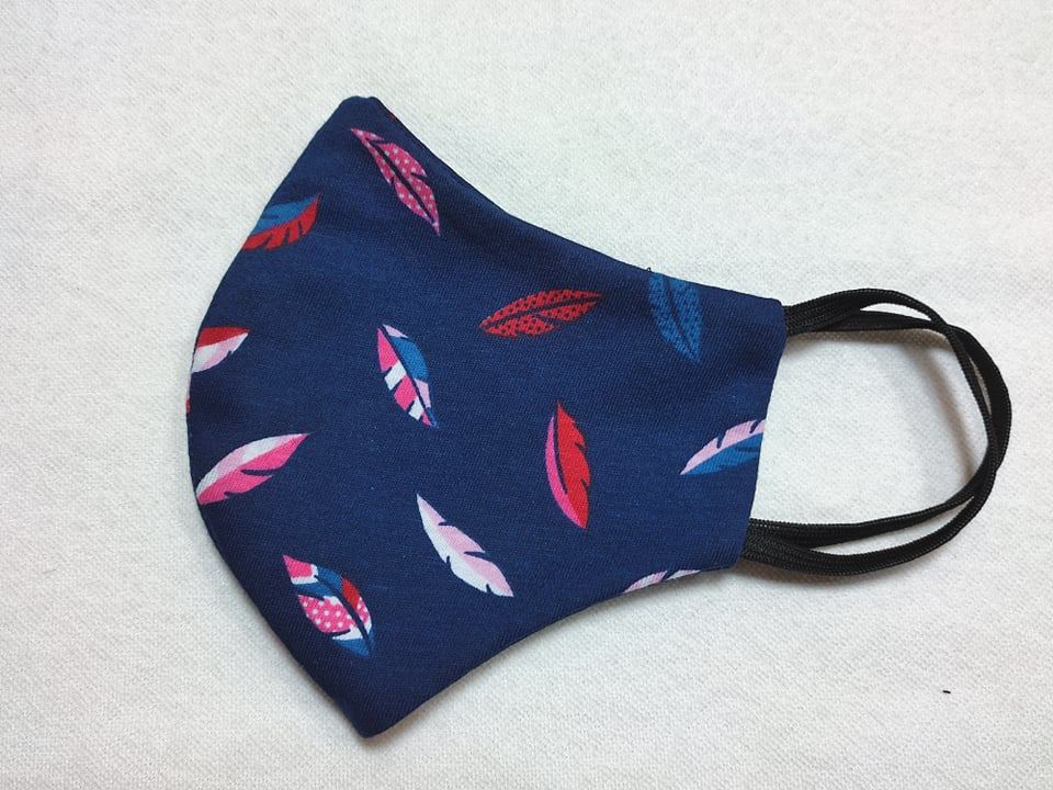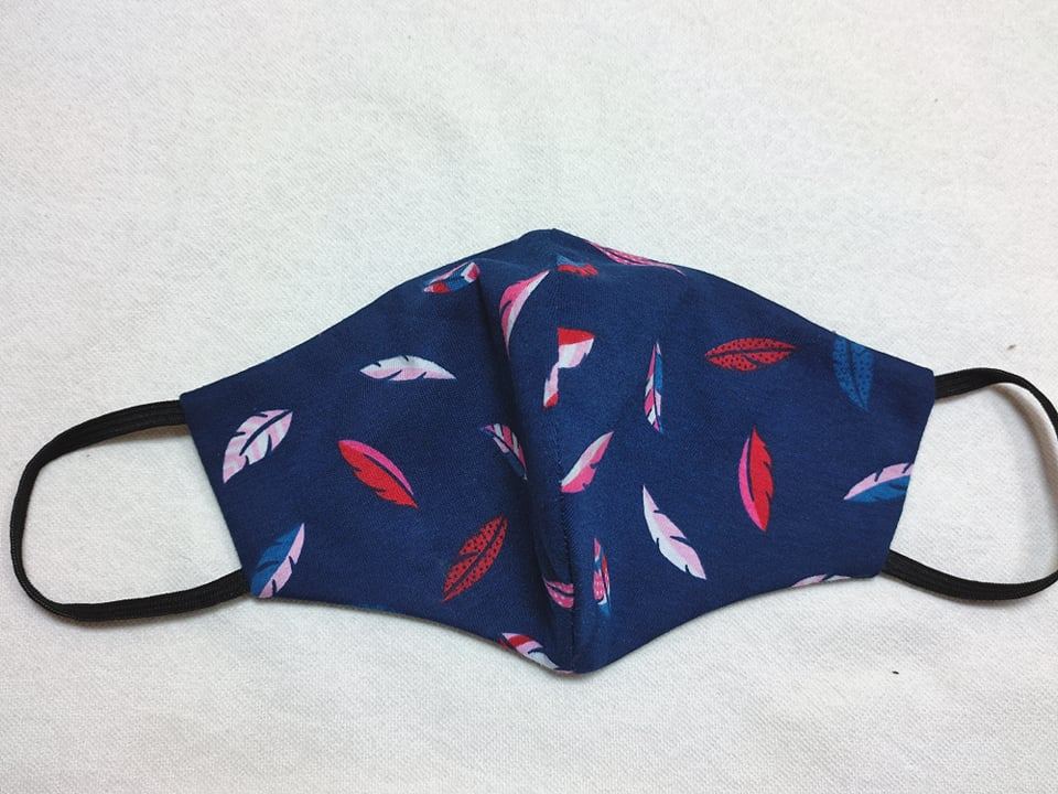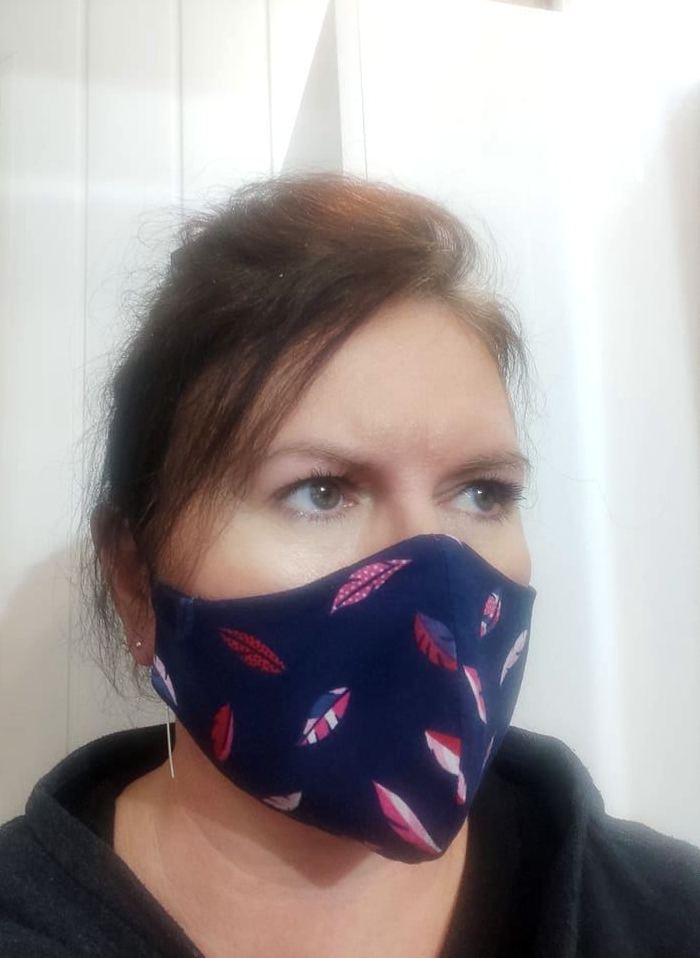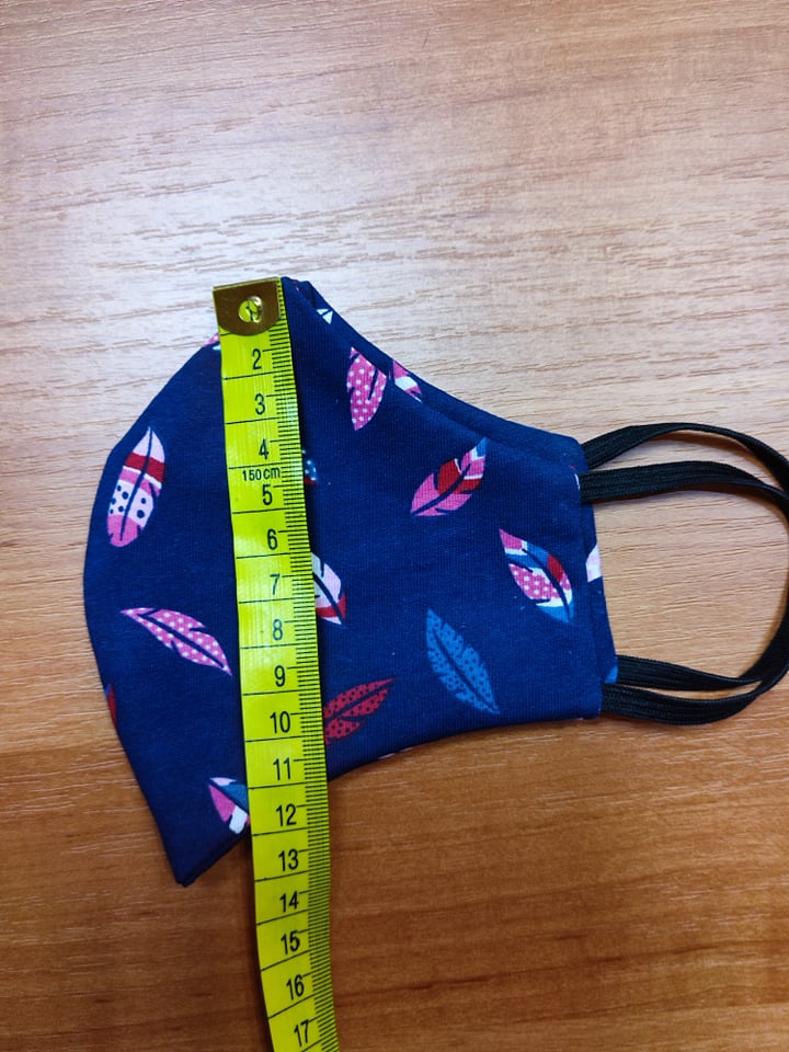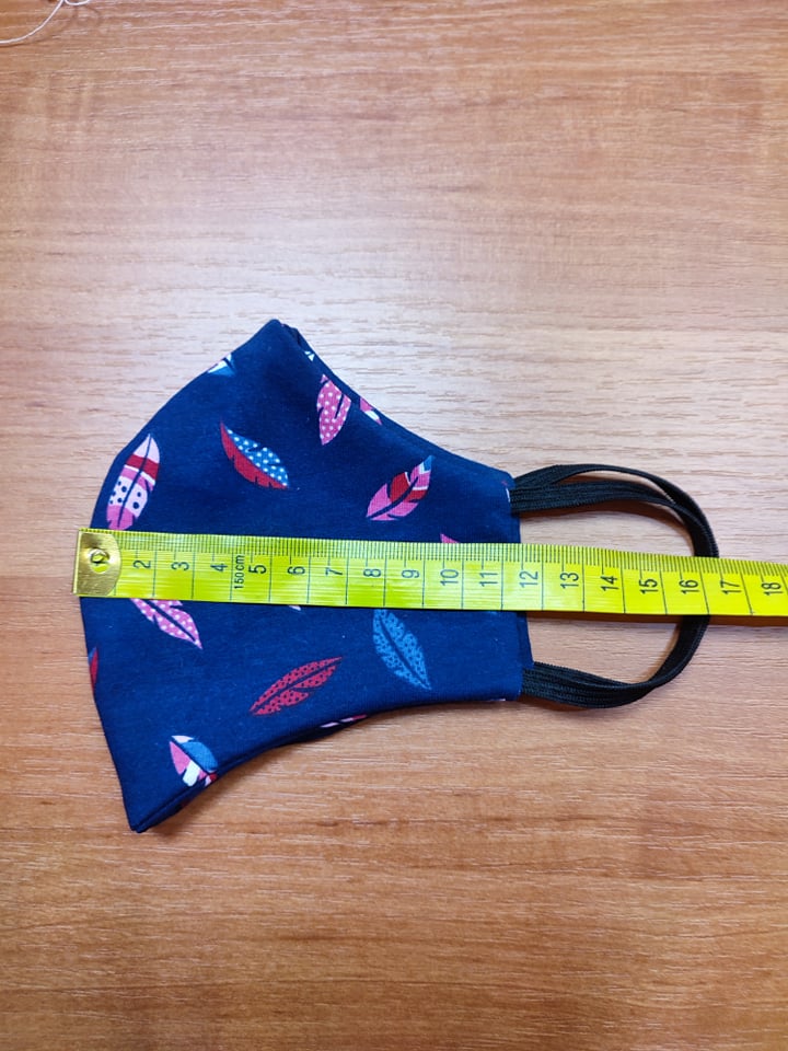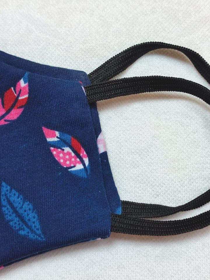 Granatowa maseczka z tkaniny bawełnianej, ładnie wyprofilowana do twarzy i mocowana na gumki dł.15cm. Posiada dwie warstwy materiału, na wierzchu i od spodu materiał jest ten sam, w kolorowe listeczki. Ładnie przylega do twarzy zakrywając nos i usta.
