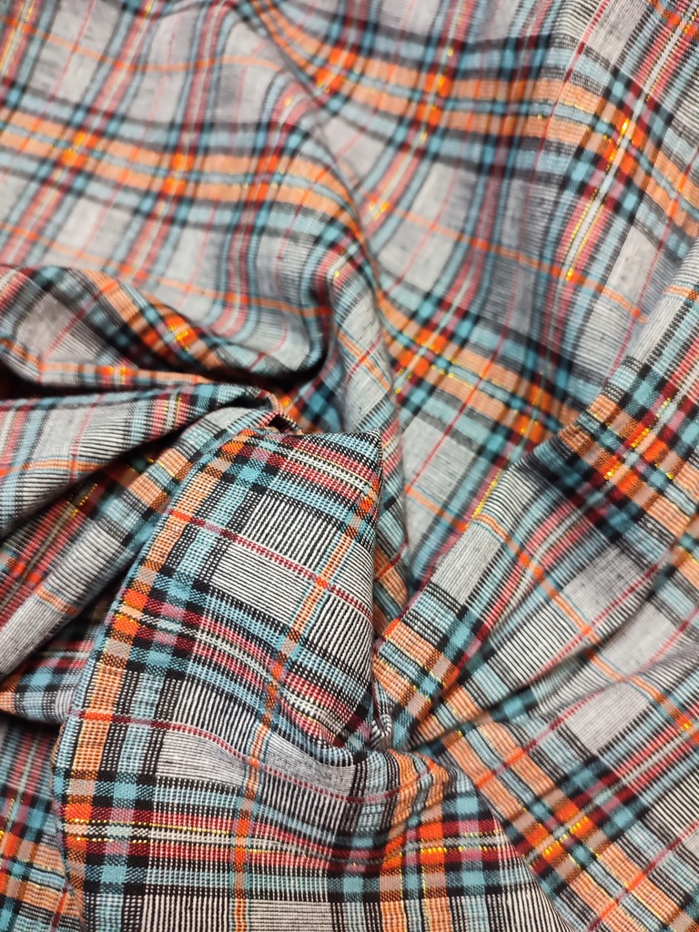 Elegancki materiał w szarej tonacji będzie idealny na stylową spódnicę lub sukienkę. Wielobarwny wzór w kratkę zachwyca oryginalnością i sprawi że będziesz miał stylowy image Jest to lekko kreszowany materiał w odcieniach szarości i pomarańczy, przetykany delikatną złotą niteczką. Materiał gruby, oddychający oraz bardzo elastyczny po szerokości, dosyć sztywny. Skład to wysokiej jakości bawełna z dodatkiem lycry.