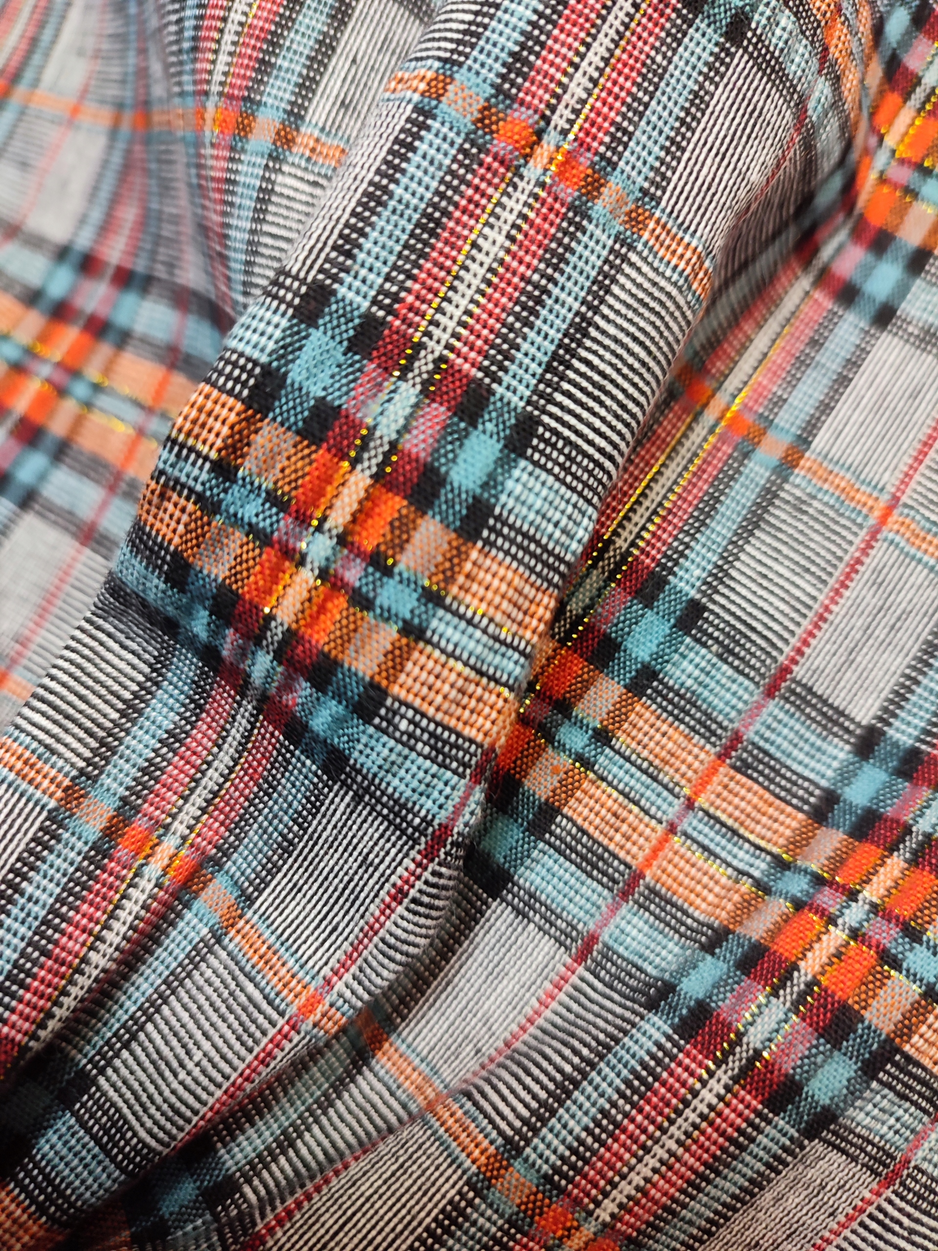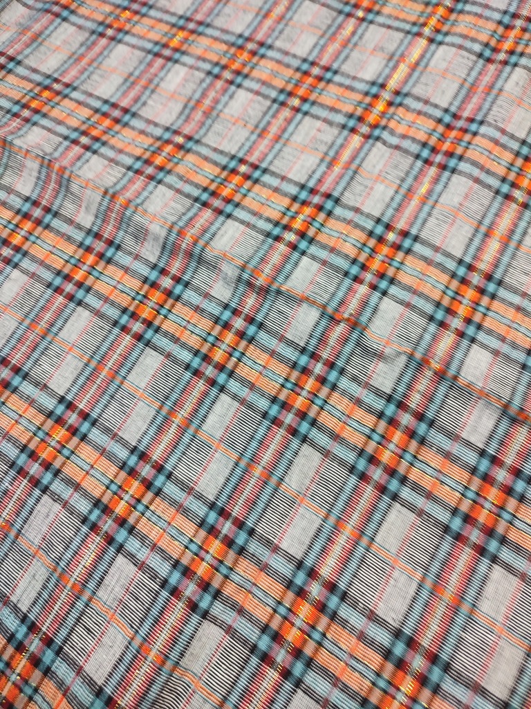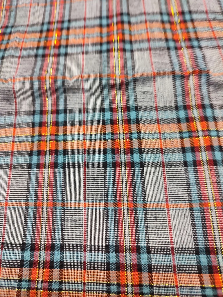 piękna krata w odcieniach niebieskiego oraz słodkiej pomarańczy, przetykany złotą niteczką