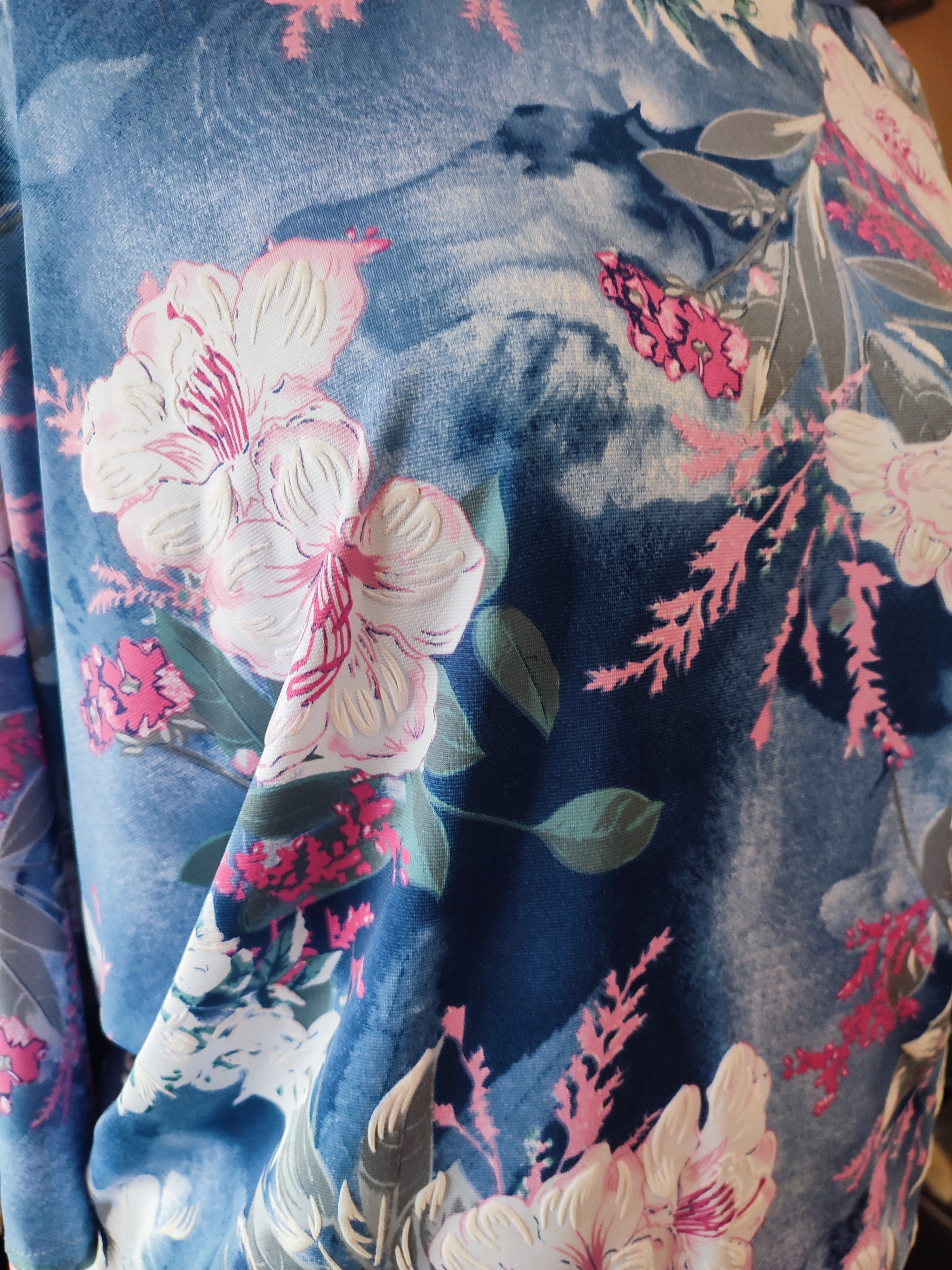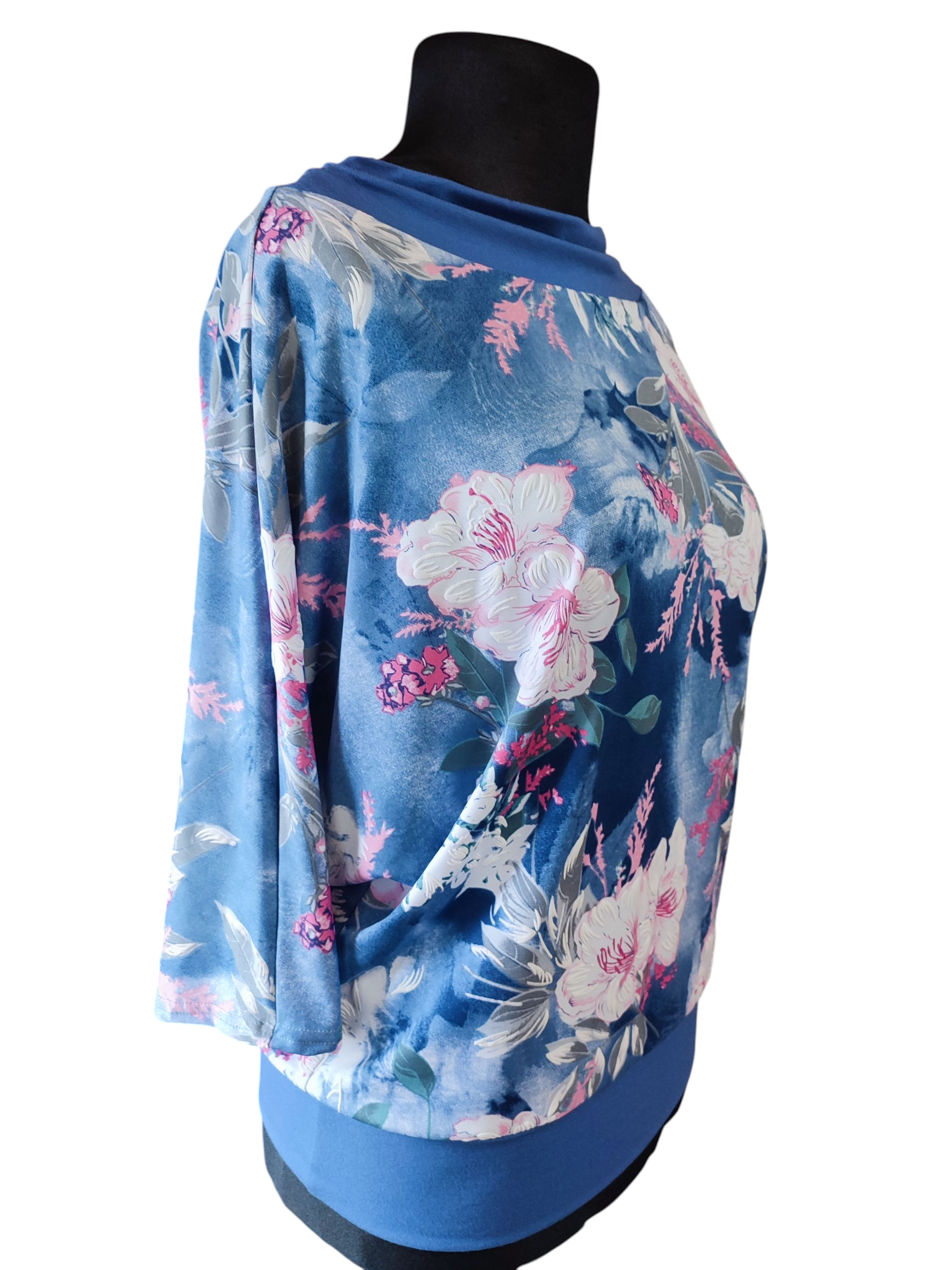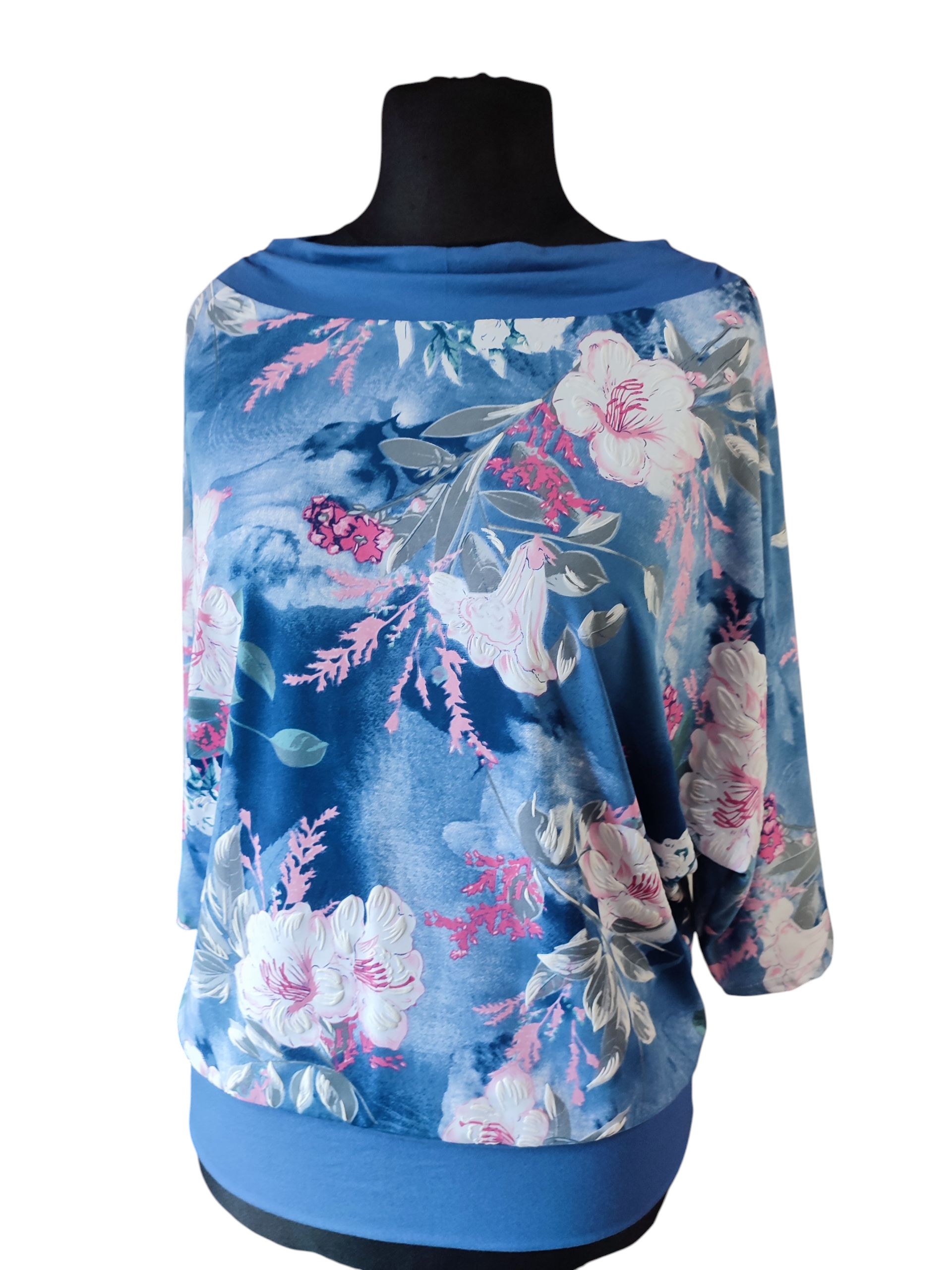 Na dole podwójny niebieski ściągacz pozwalający na regulację długości. Rękawek niezbyt długi. Luźny wygodny fason sprawi że poczujesz się komfortowo. Bluzka będzie idealna na jesienne szarobure dni, kolorowy motyw kwiatowy doda blasku twojej cerze.