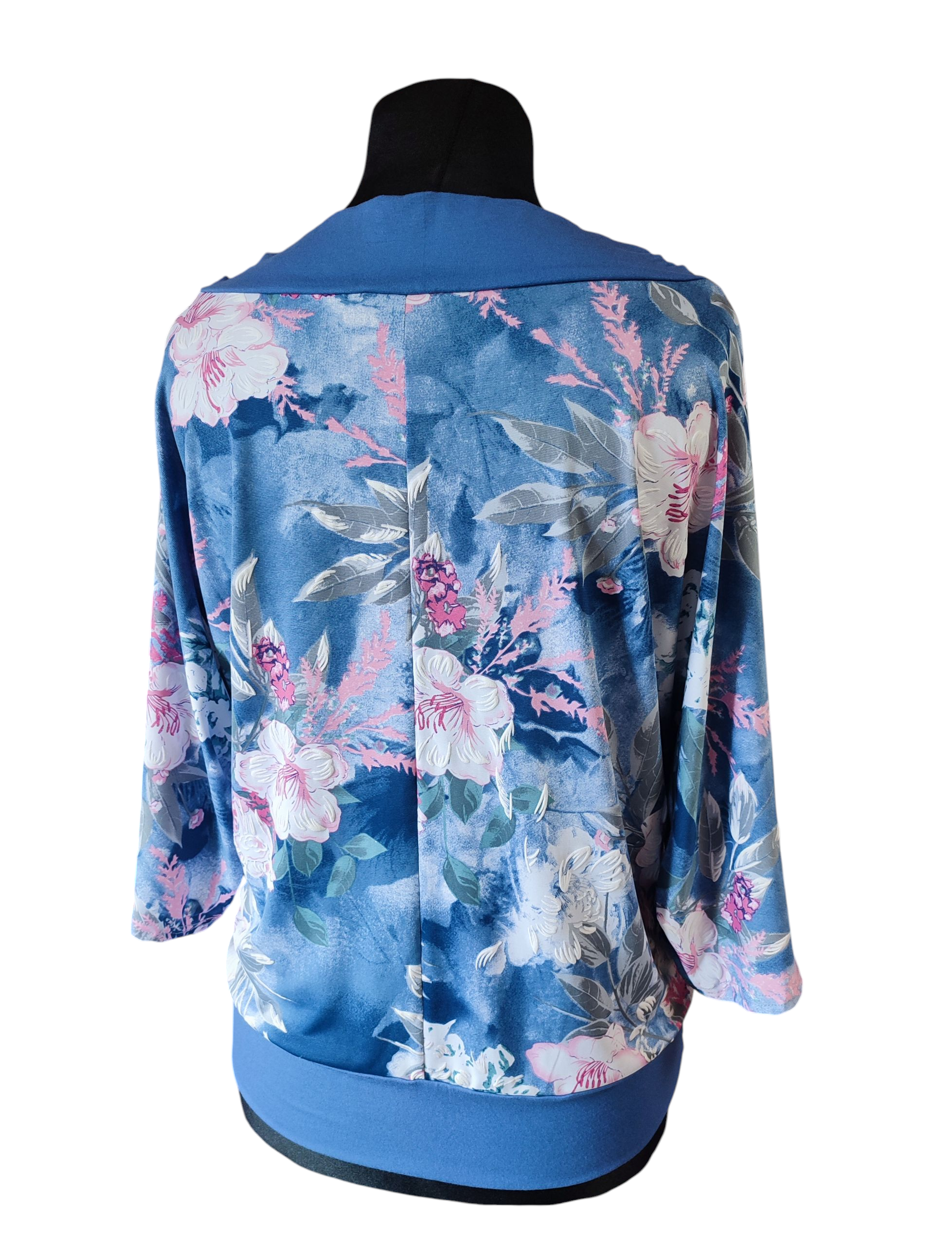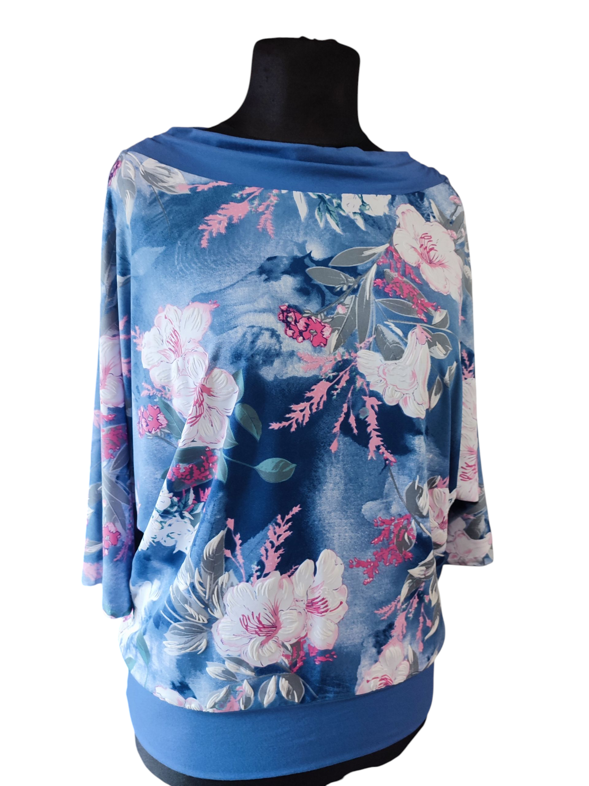 Strona główna » Bluzki Petite » Bluzki typu kimono » Niebieska bluzka kimono z marszczonym dekoltem - wzór w kwiaty
