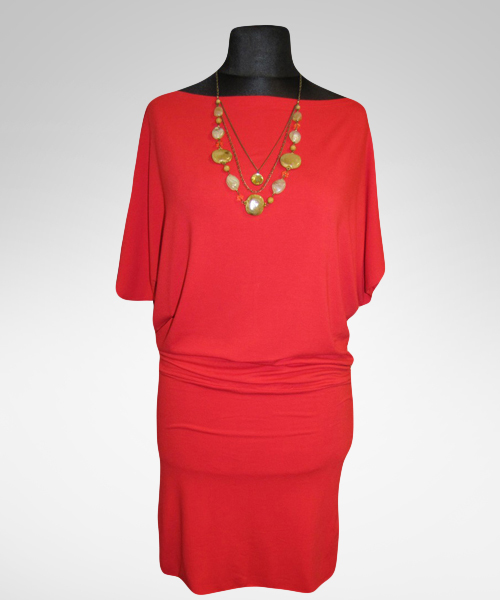 Subtelna sukienka tunika uszyta z miękkiej i rozciągliwej dzianiny, która pięknie układa się na sylwetce. Góra jest dosyć luźna, rękawy typu kimono, dekolt łódka lekko opada na ramiona. Dół sukienki uszyty jest z podwójnie złożonego materiału, mocno przylega do figury i efektownie podkreśla kobiece kształty. Materiał miękki, elastyczny, nie traci koloru po wypraniu.