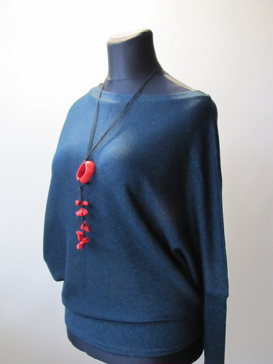Nasza propozycja na wieczorowe imprezy - asymetryczny sweter z miękkiej dzianiny w przepięknym kolorze ciemnej zieleni, dodatkowo zdobiony błyszczącą niteczką. Dekolt typu łódeczka możesz rozciągnąć na bok aby odsłonić jedno ramię. Fason asymetryczny z jednaj strony szerszy a rękawy zakończone długimi mankietami. Luźny fason oversize świetnie zatuszuje mankamenty figury.