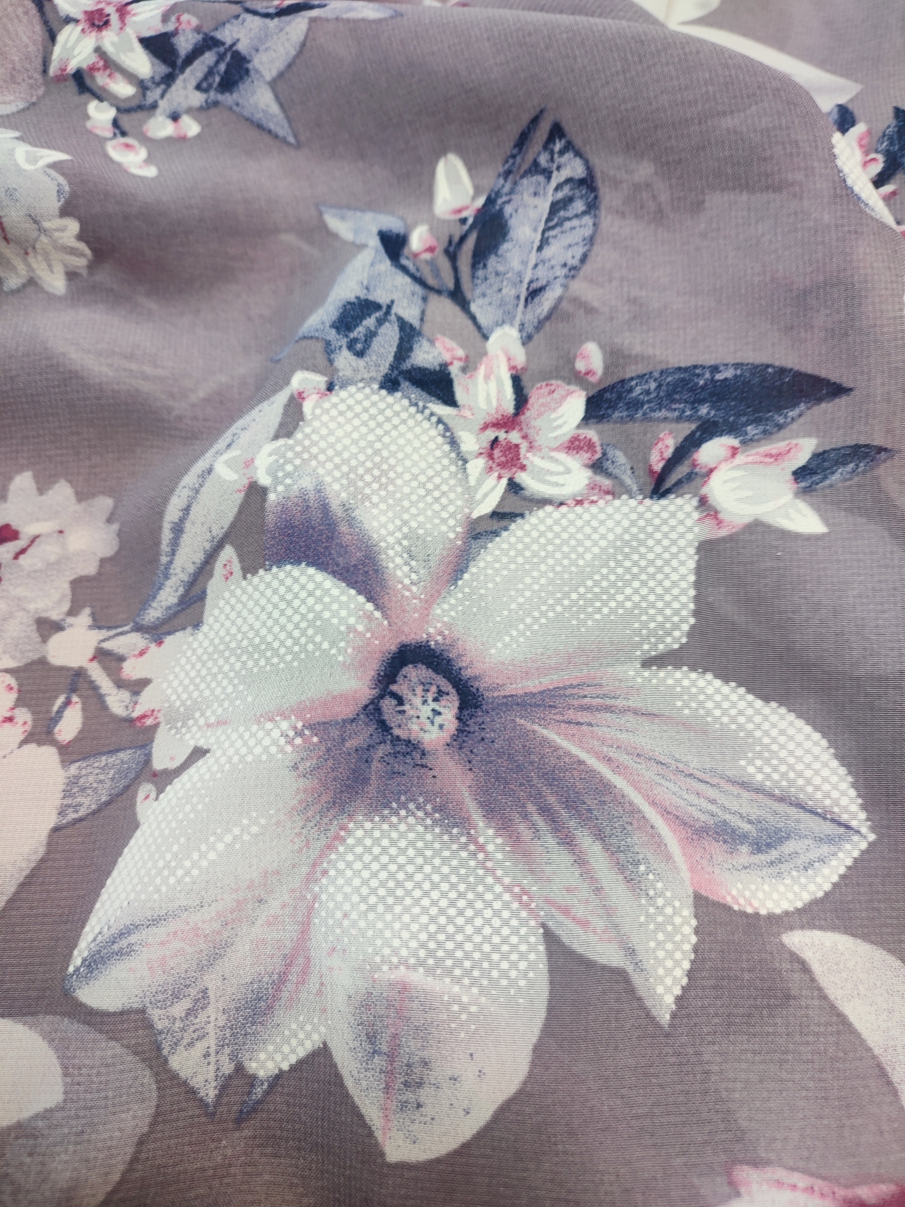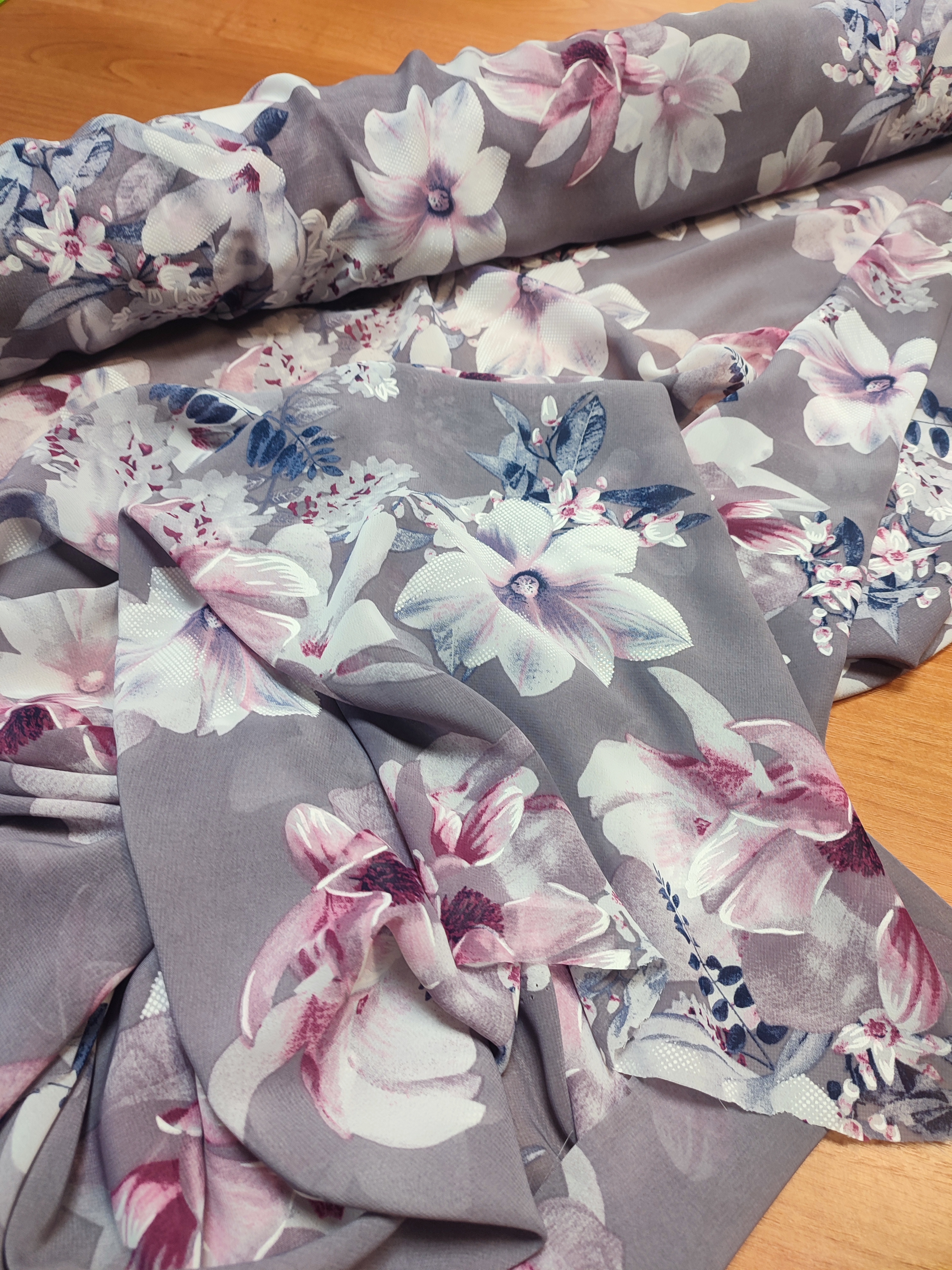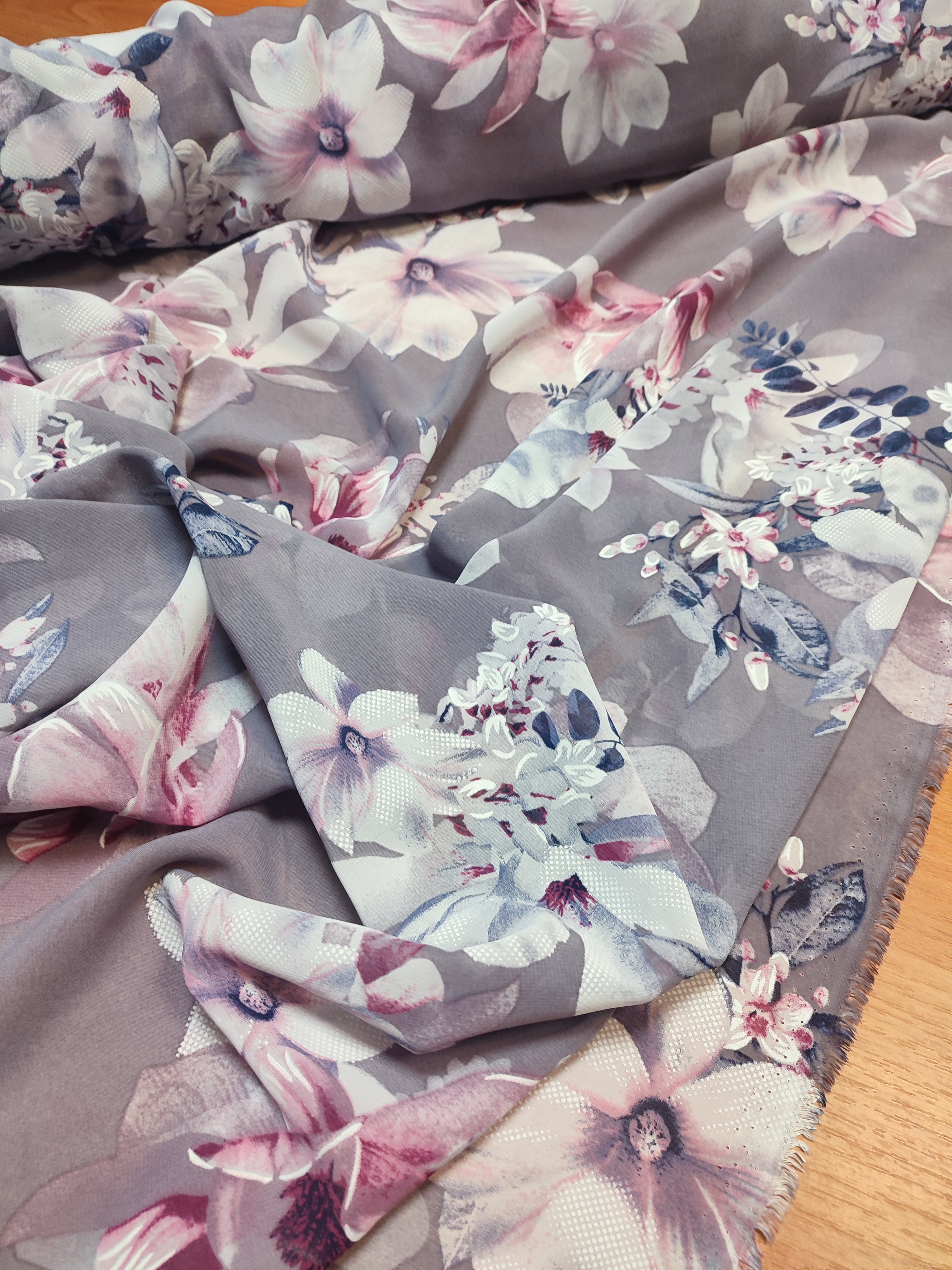 Strona główna » Tkaniny » Szary szyfon cienka tkanina na sukienki - białe kwiaty amarylis