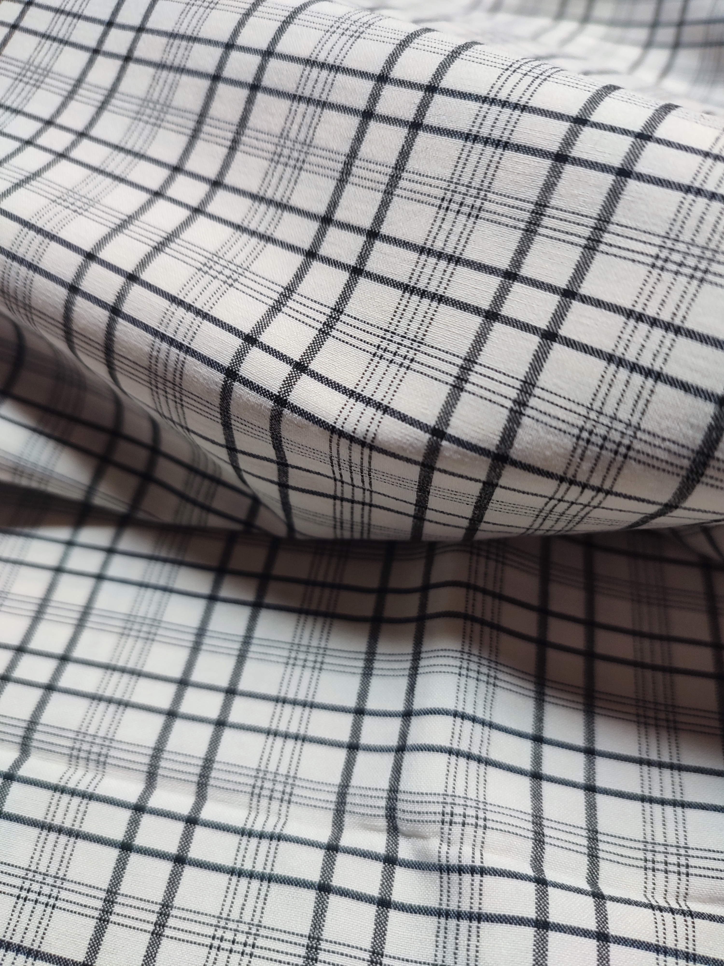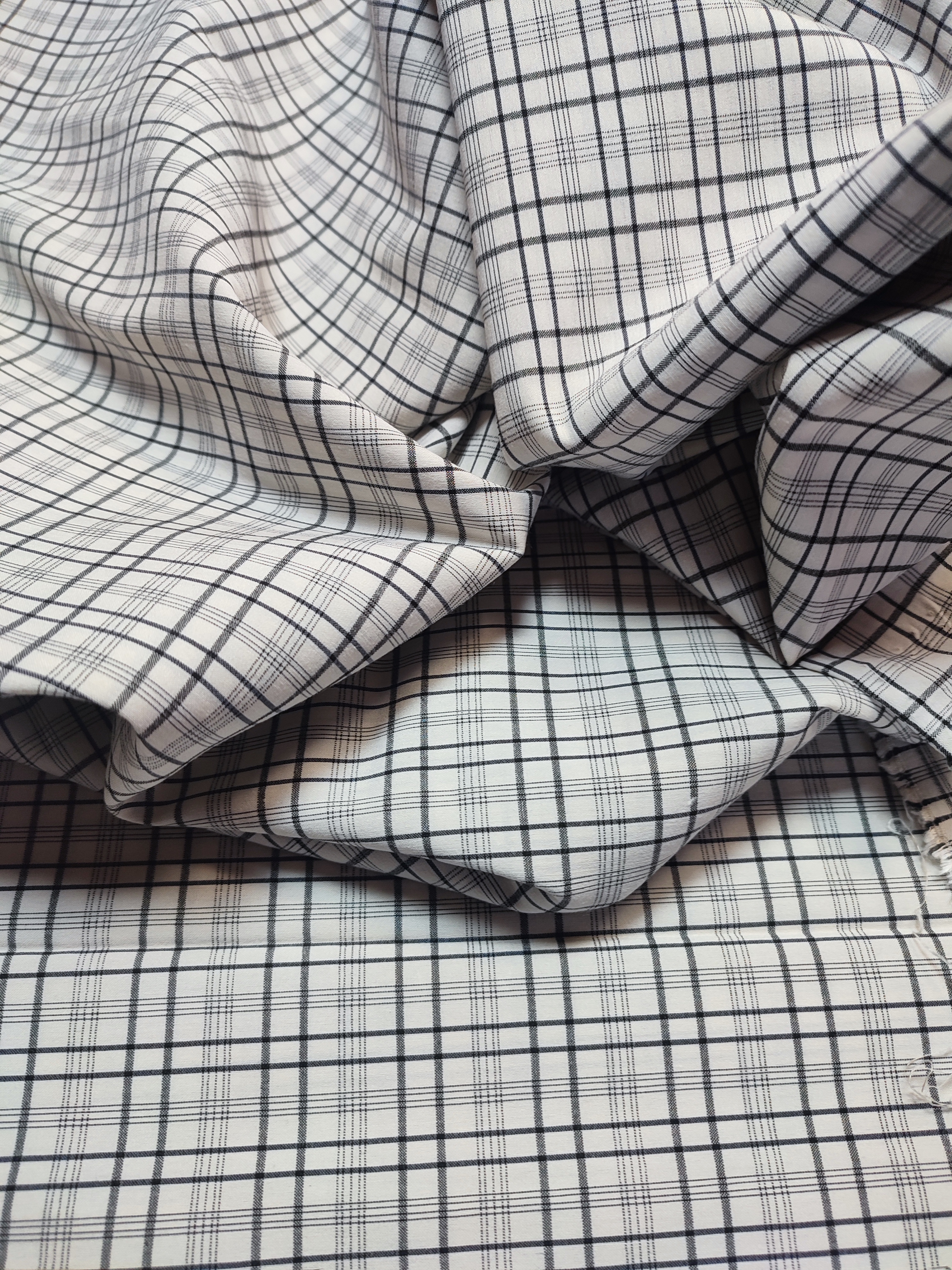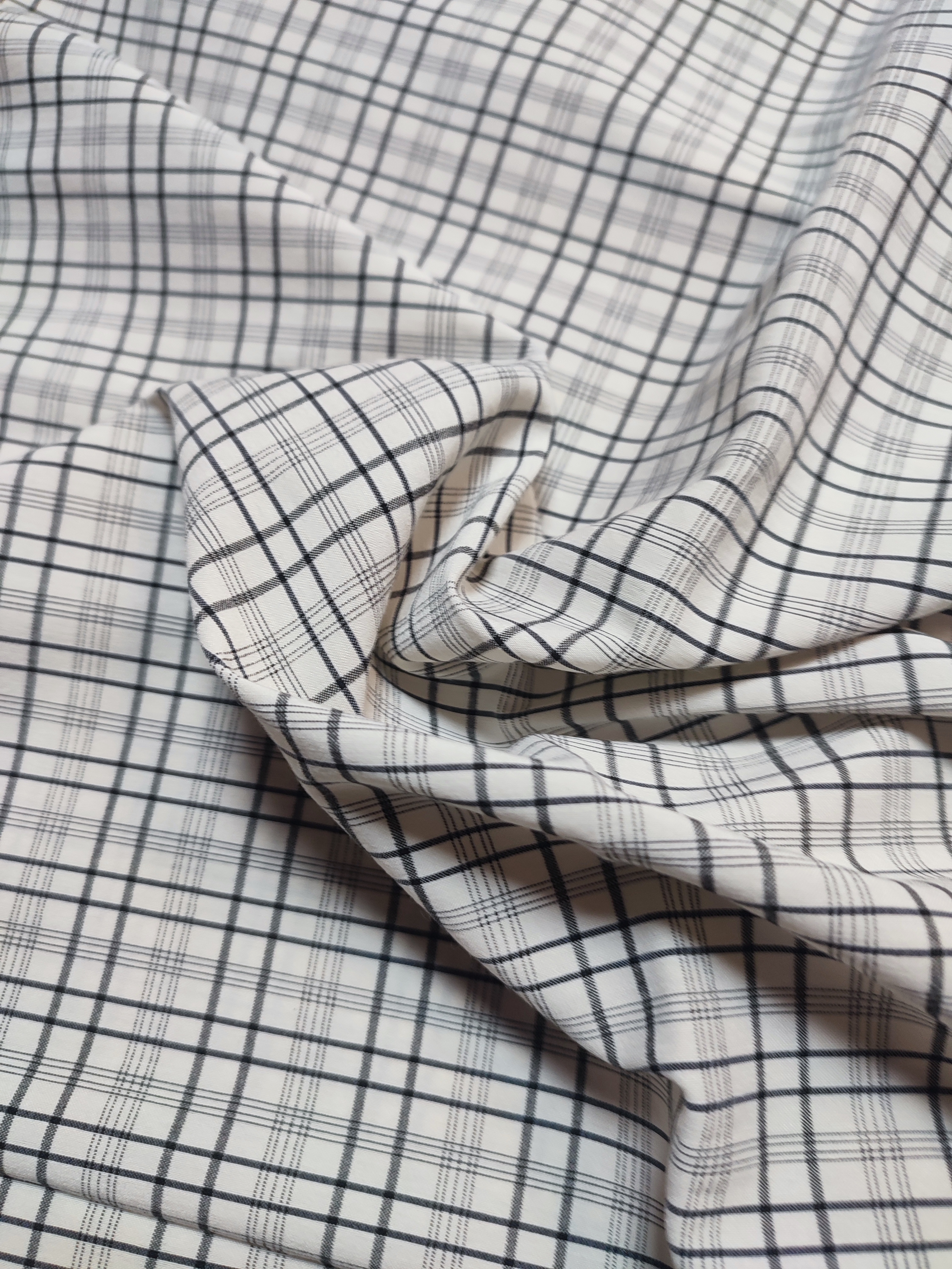 Przepiękna cienka tkanina bawełniana w grafitową krateczkę świetnie sprawdzi się jako materiał na koszulę. Materiał miękki, dzięki dodatkowi lycry bardzo elastyczny po długości, nie gniecie się. Klasyczny wzór w kratkę zachwyca delikatnością