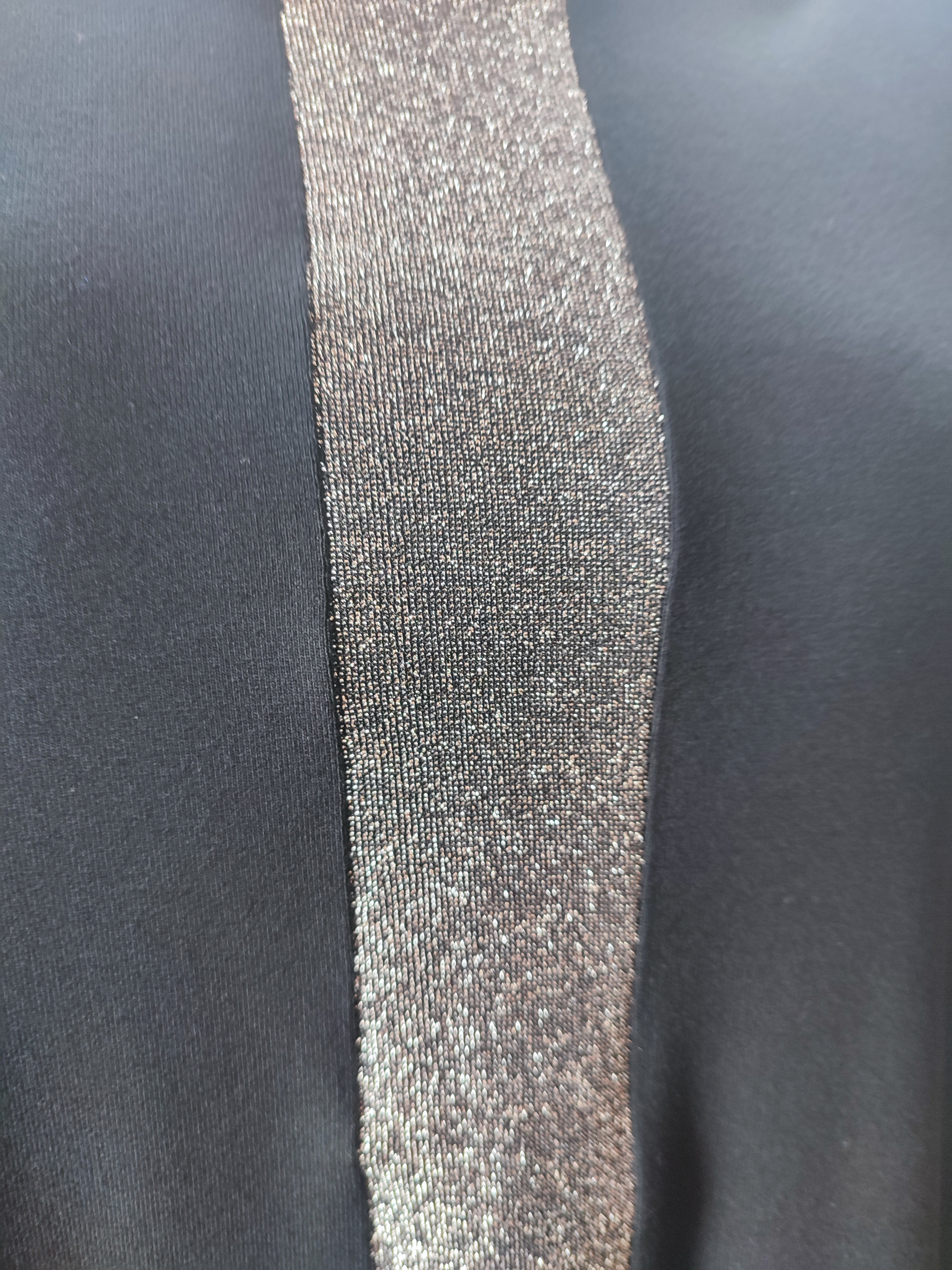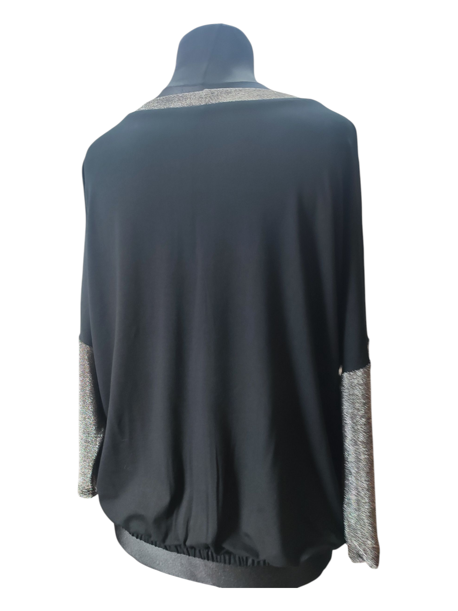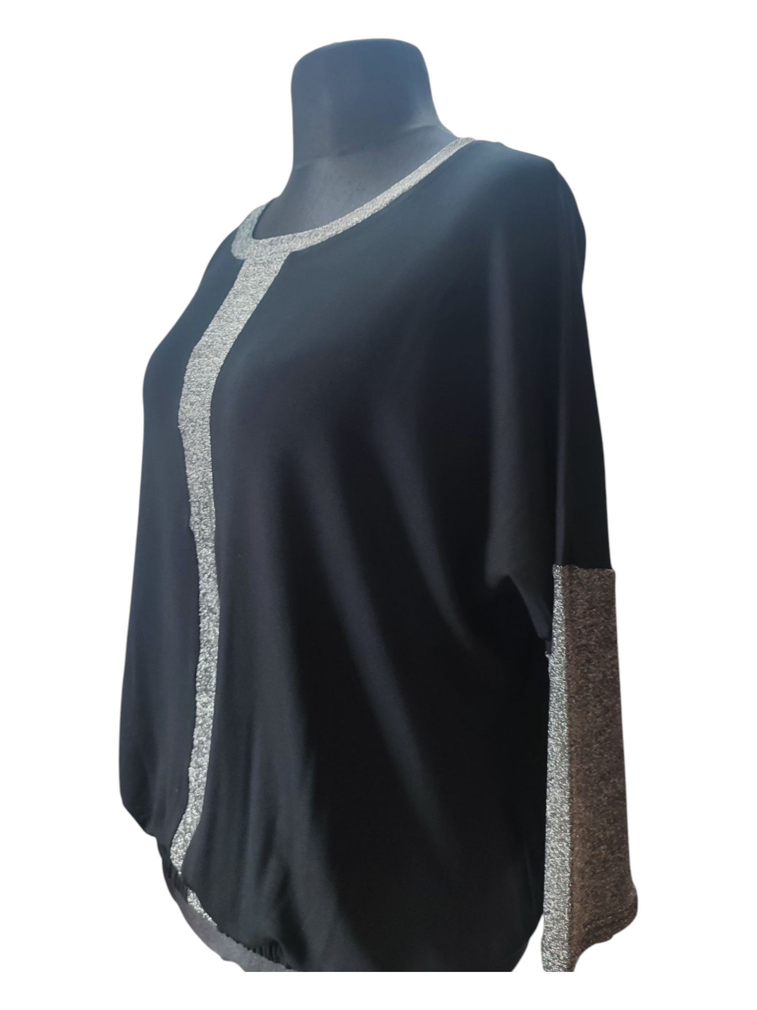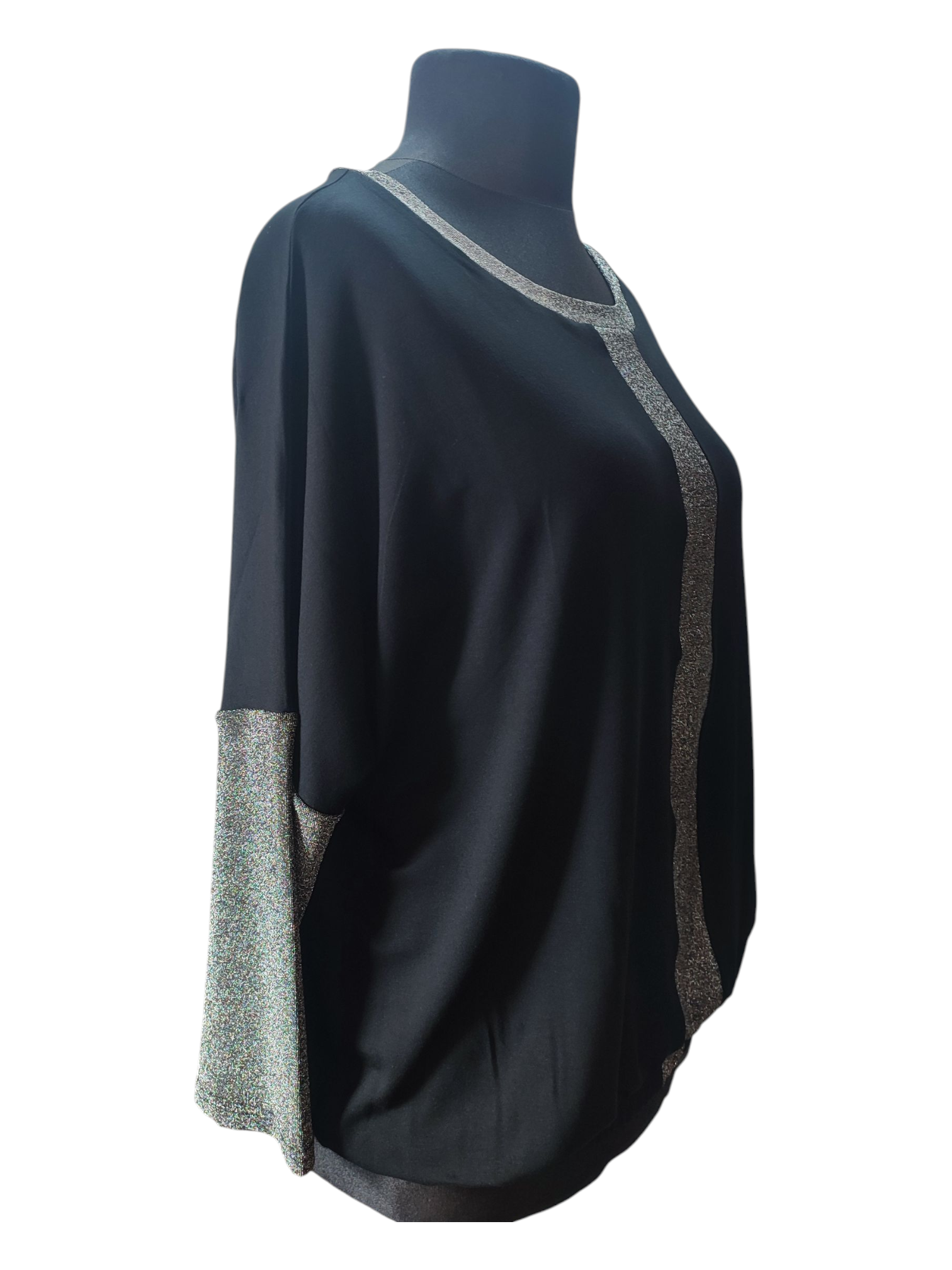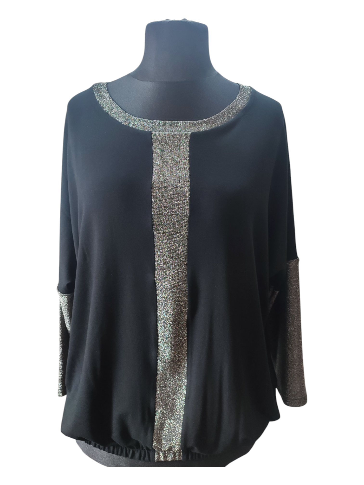 Wieczorowa czarna bluzka o luźnym kroju to nasza propozycja dla pań, które chcą ukryć swoje niedoskonałości a jednocześnie wyglądać wyjątkowo. Na przodzie ozdobiona panelem z błyszczącymi niteczkami, rękawy z tego samego materiału, mocno błyszczące srebrem. Dekolt wykończony lśniąca lamówką. Tył prosty, luźno układa się do sylwetki. Wygodny fason Oversize zamaskuje wszelkie braki figury np. brak talii czy spory brzuszek. Dodatkowo kolor czarny to klasyka która zawsze wyszczupla sylwetkę. Jest zawsze modny i odpowiedni na każdą okazję.
