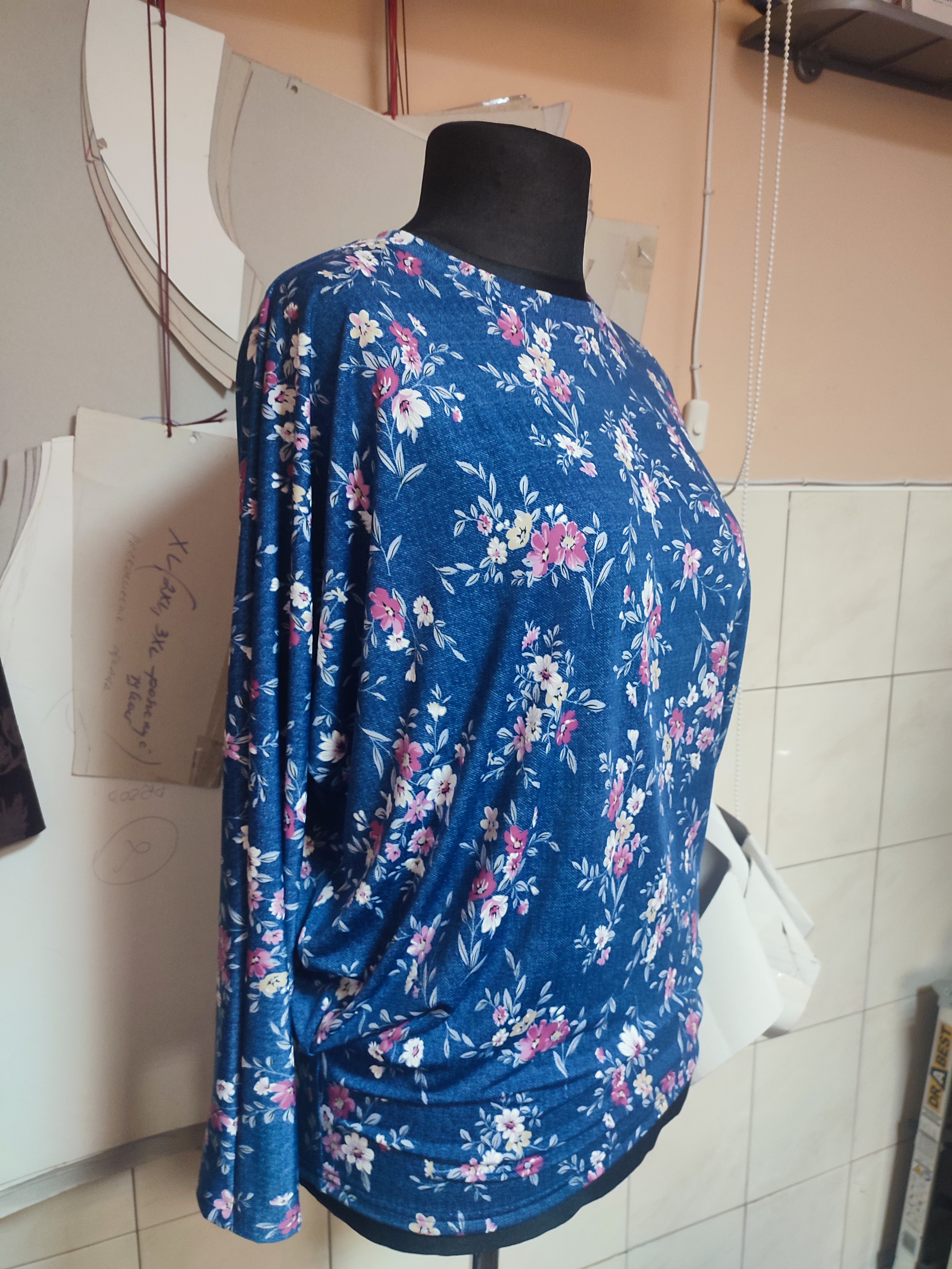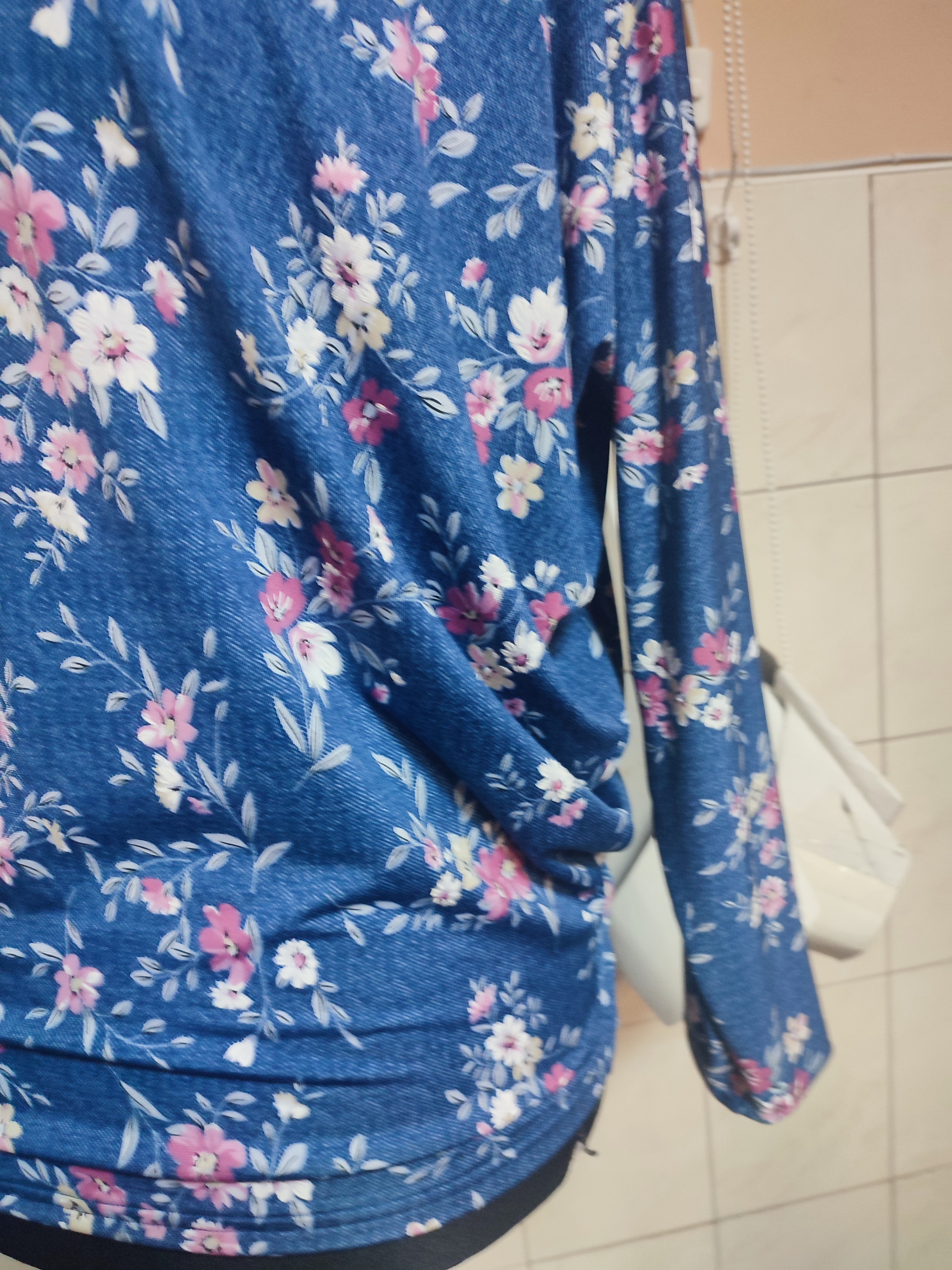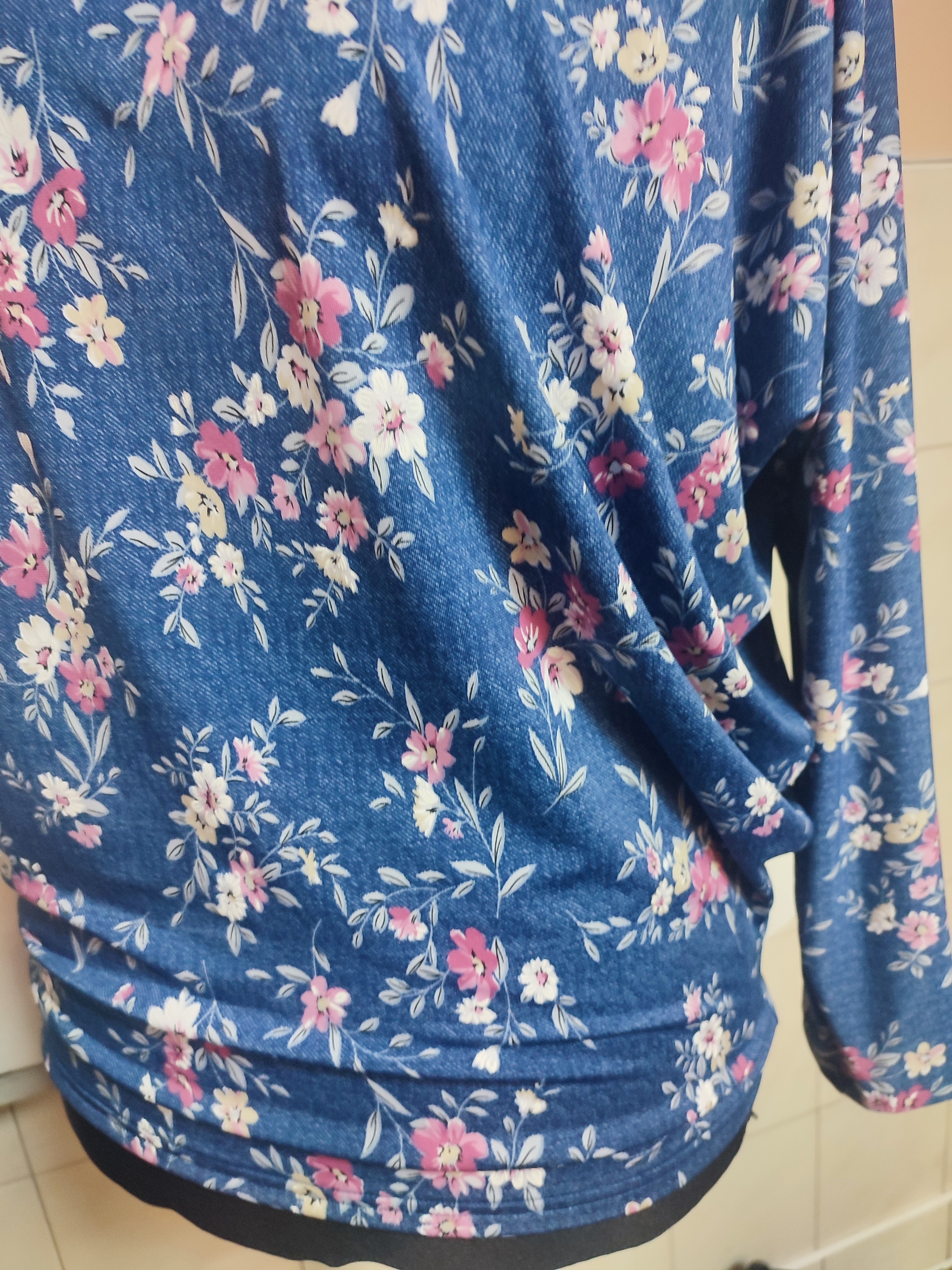 Materiał z którego uszyta jest bluzeczka to delikatny jersey poliestrowy - lekki, cienki, lejący oraz mocno elastyczny ponieważ rozciąga się zarówno po długości jak i po szerokości. Niespotykany wzór w pudrowe kwiatuszki w kolorach różu i bieli skomponowane na niebieskim tle dodają lekkości tej kreacji. Gdy za oknem jest szaruga jesienna lub zimowa zawieja i pada śnieg, w naszych mieszkaniach jest gorąco więc warto ubierać lżejsze rzeczy w których nie spocisz się jak w swetrze.