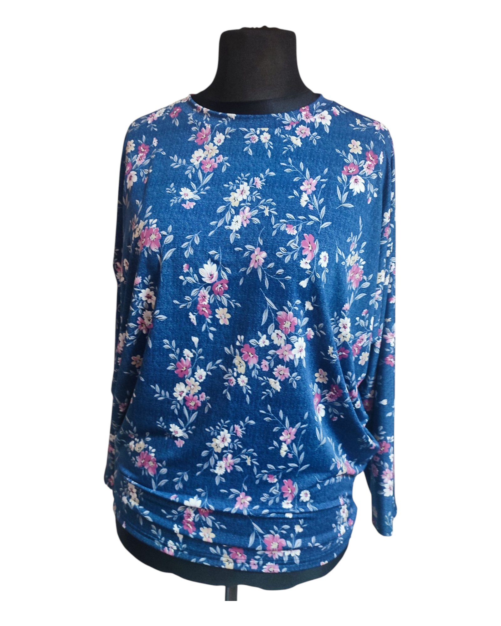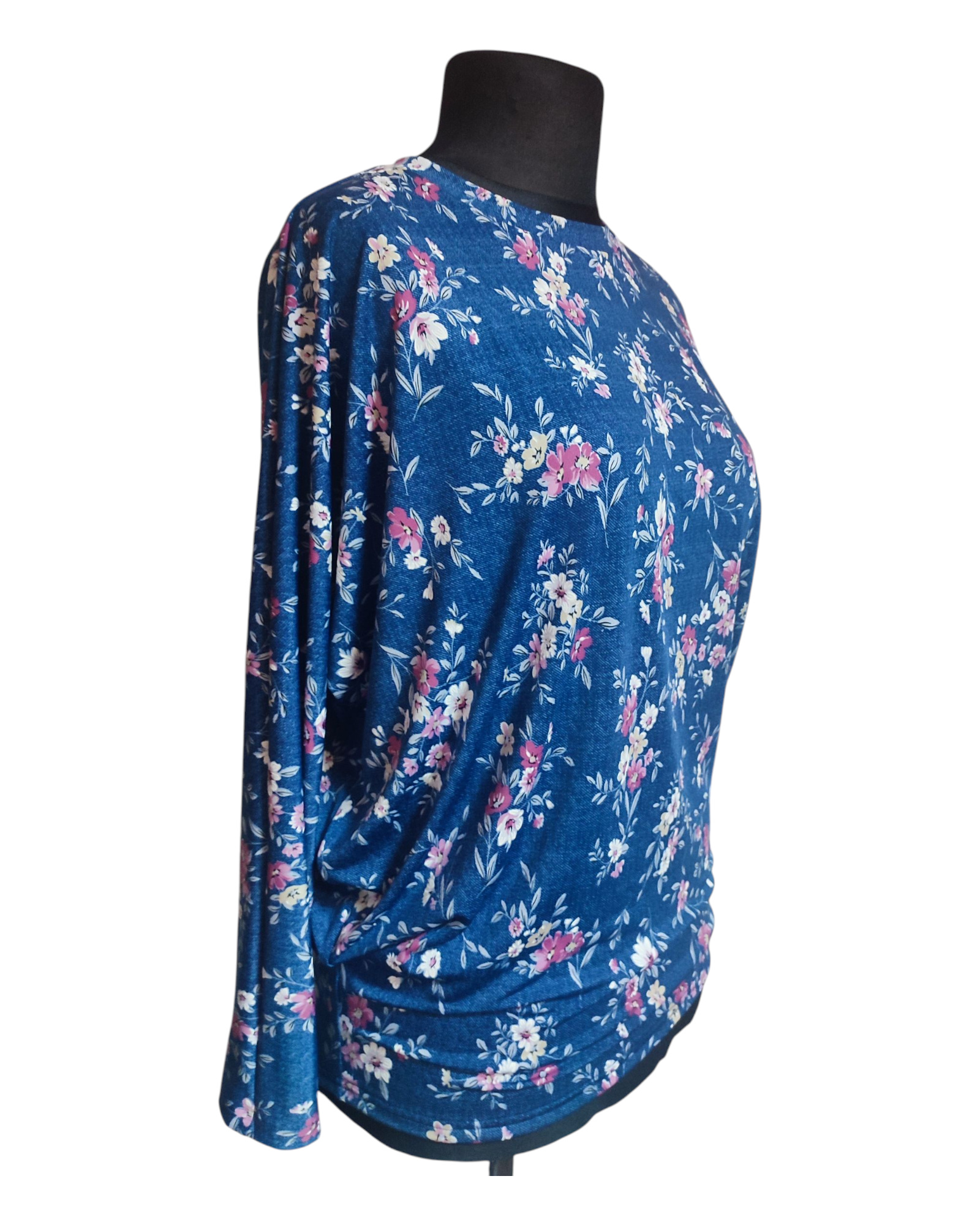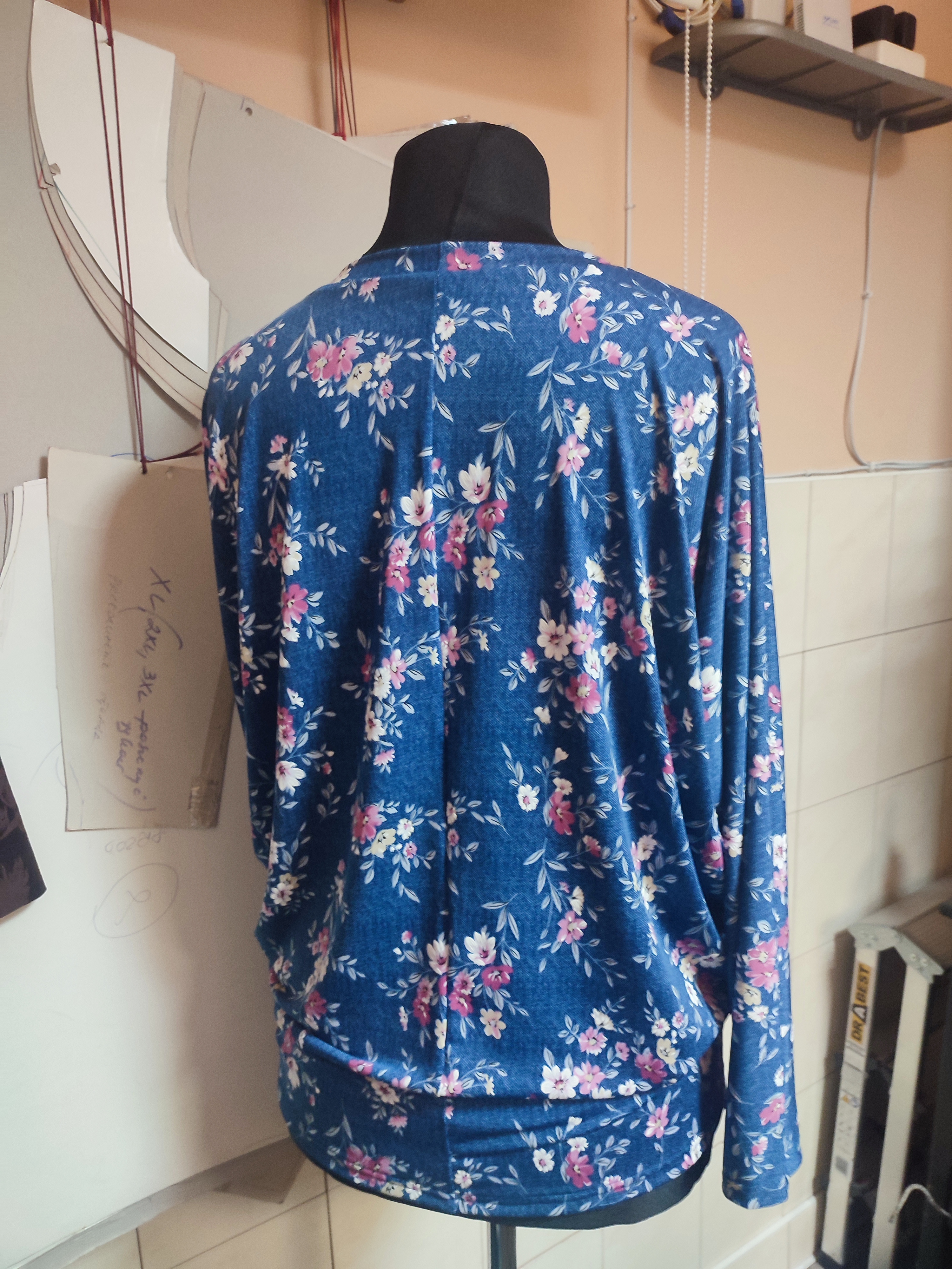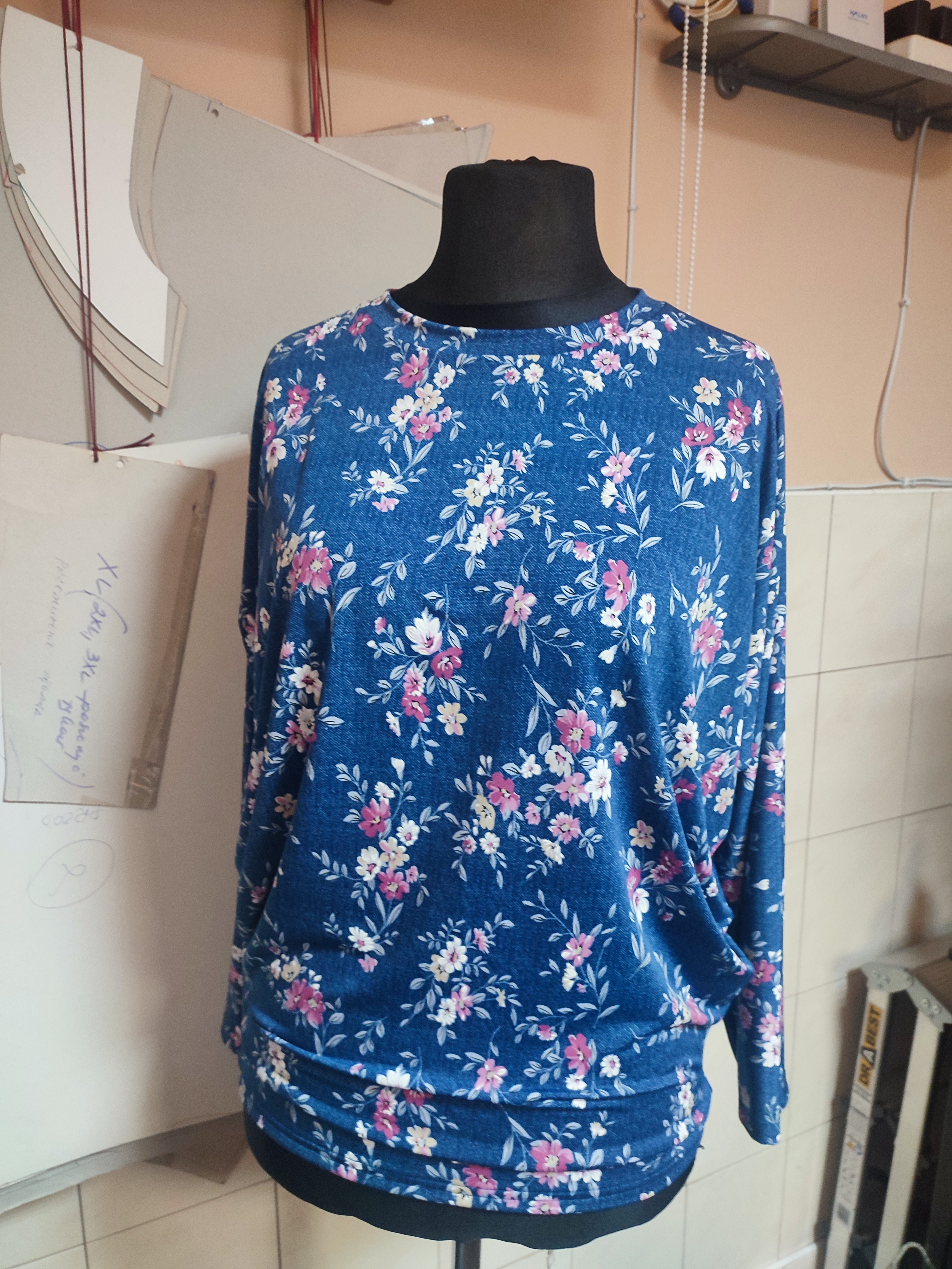 Materiał z którego uszyta jest bluzeczka to delikatny jersey poliestrowy - lekki, cienki, lejący oraz mocno elastyczny ponieważ rozciąga się zarówno po długości jak i po szerokości. Niespotykany wzór w pudrowe kwiatuszki w kolorach różu i bieli skomponowane na niebieskim tle dodają lekkości tej kreacji. Gdy za oknem jest szaruga jesienna lub zimowa zawieja i pada śnieg, w naszych mieszkaniach jest gorąco więc warto ubierać lżejsze rzeczy w których nie spocisz się jak w swetrze.