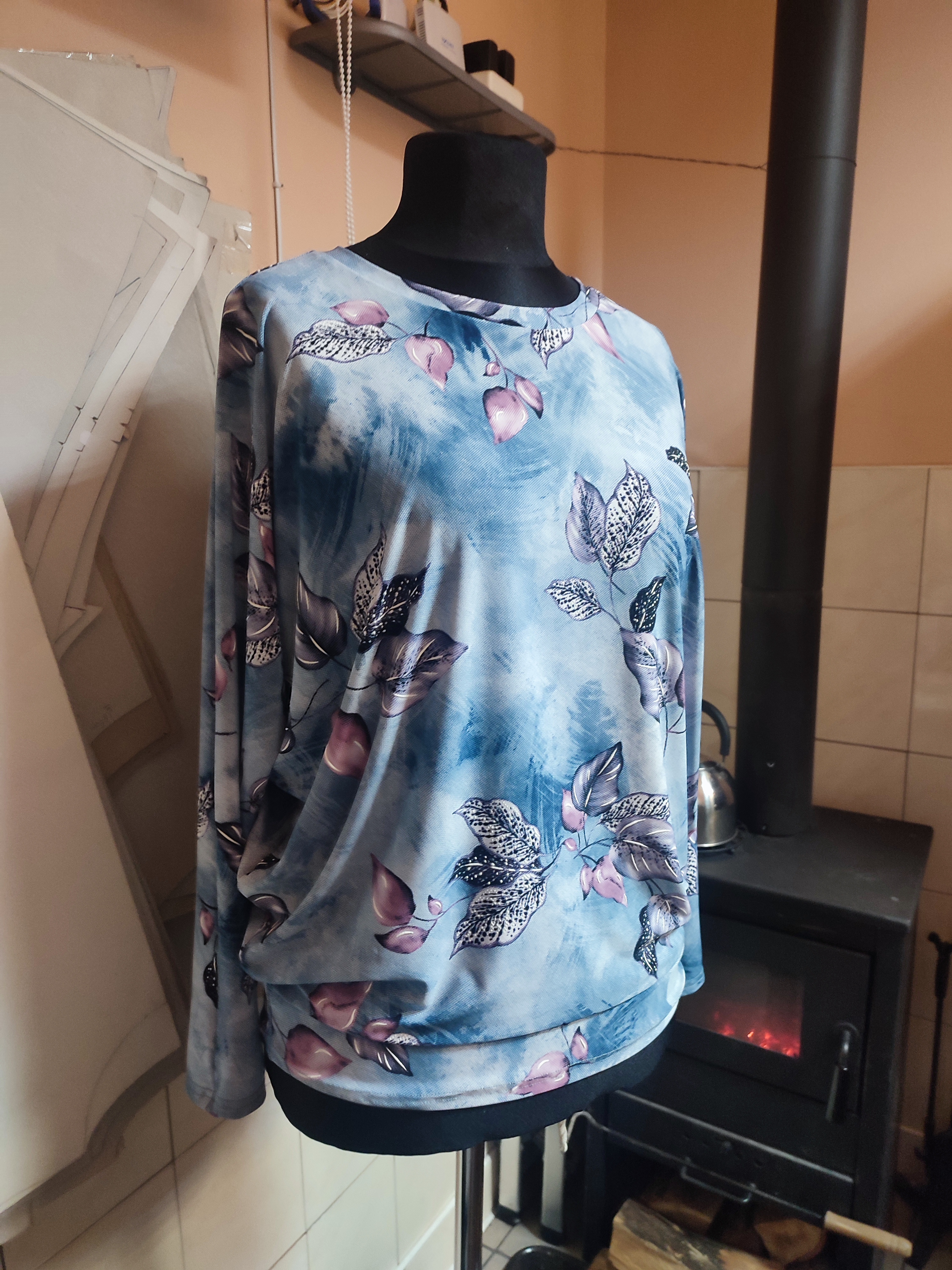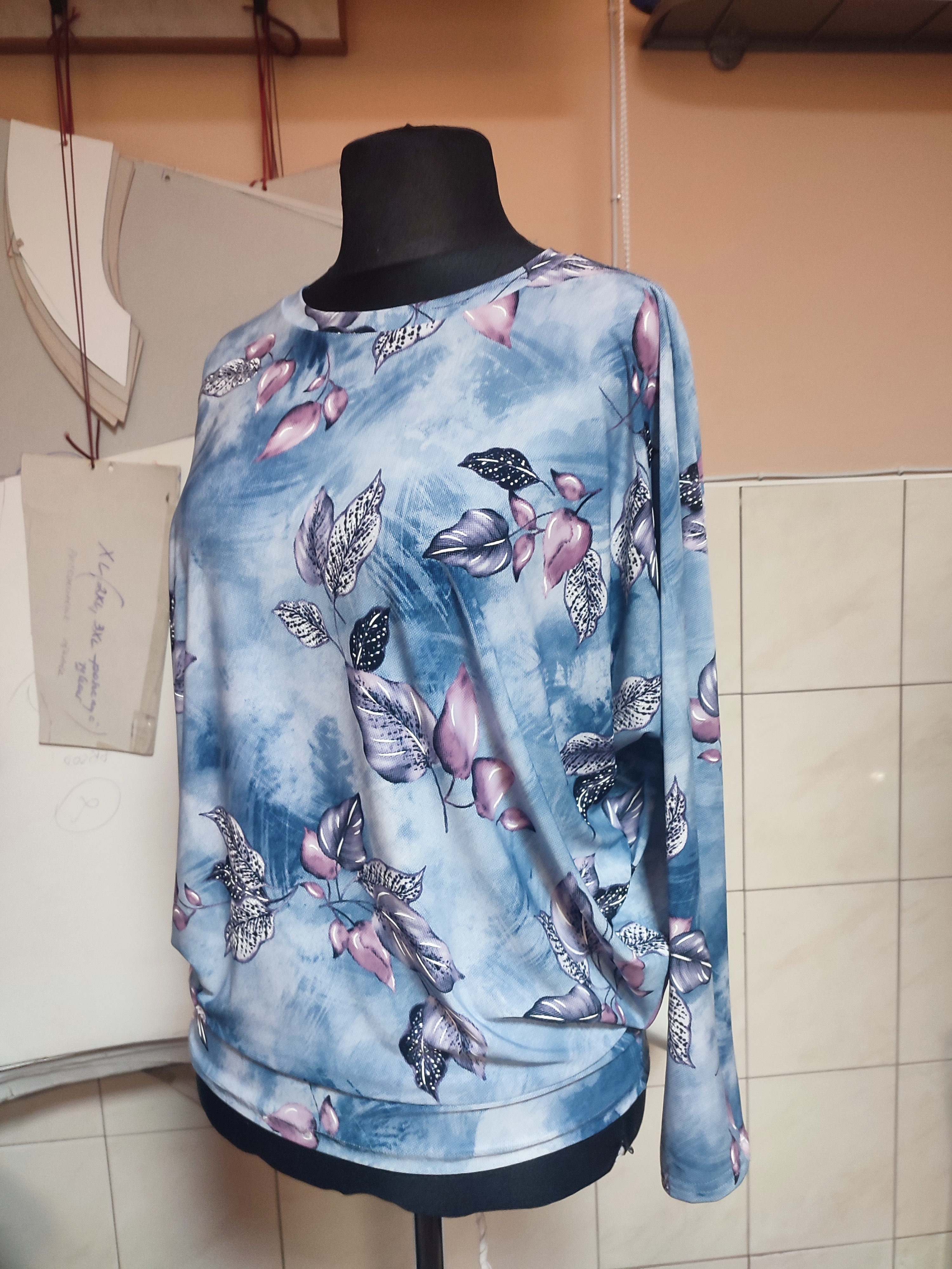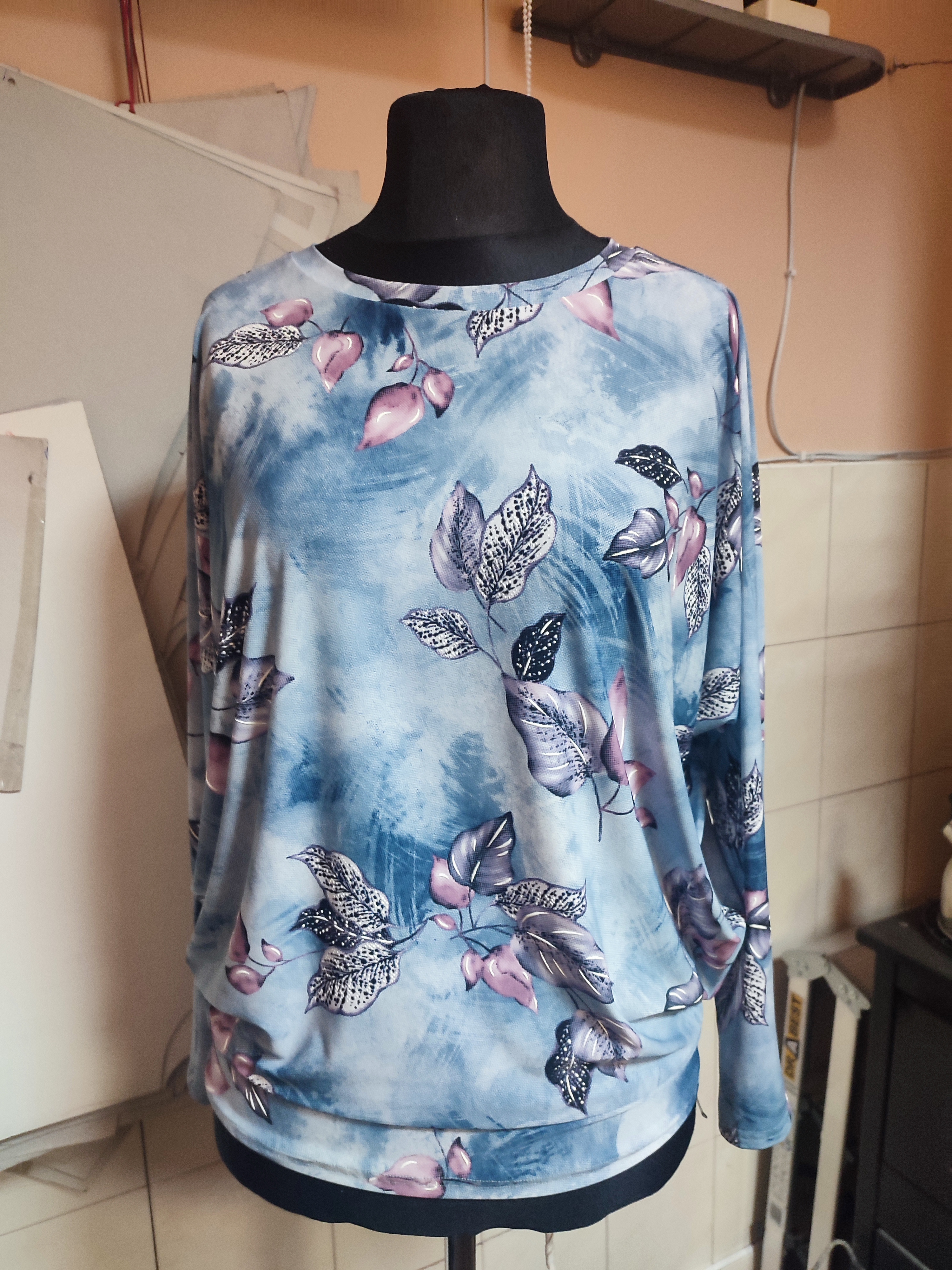 Materiał z którego uszyta jest bluzeczka to delikatny jersey poliestrowy - lekki, cienki, lejący oraz mocno elastyczny ponieważ rozciąga się zarówno po długości jak i po szerokości. Niespotykany wzór w listeczki smagane wiatrem oraz pastelowe kolory dodają lekkości tej kreacji. Gdy za oknem jest szaruga jesienna lub zimowa zawieja i pada śnieg, w naszych mieszkaniach jest gorąco więc warto ubierać lżejsze rzeczy w których nie spocisz się jak w swetrze.