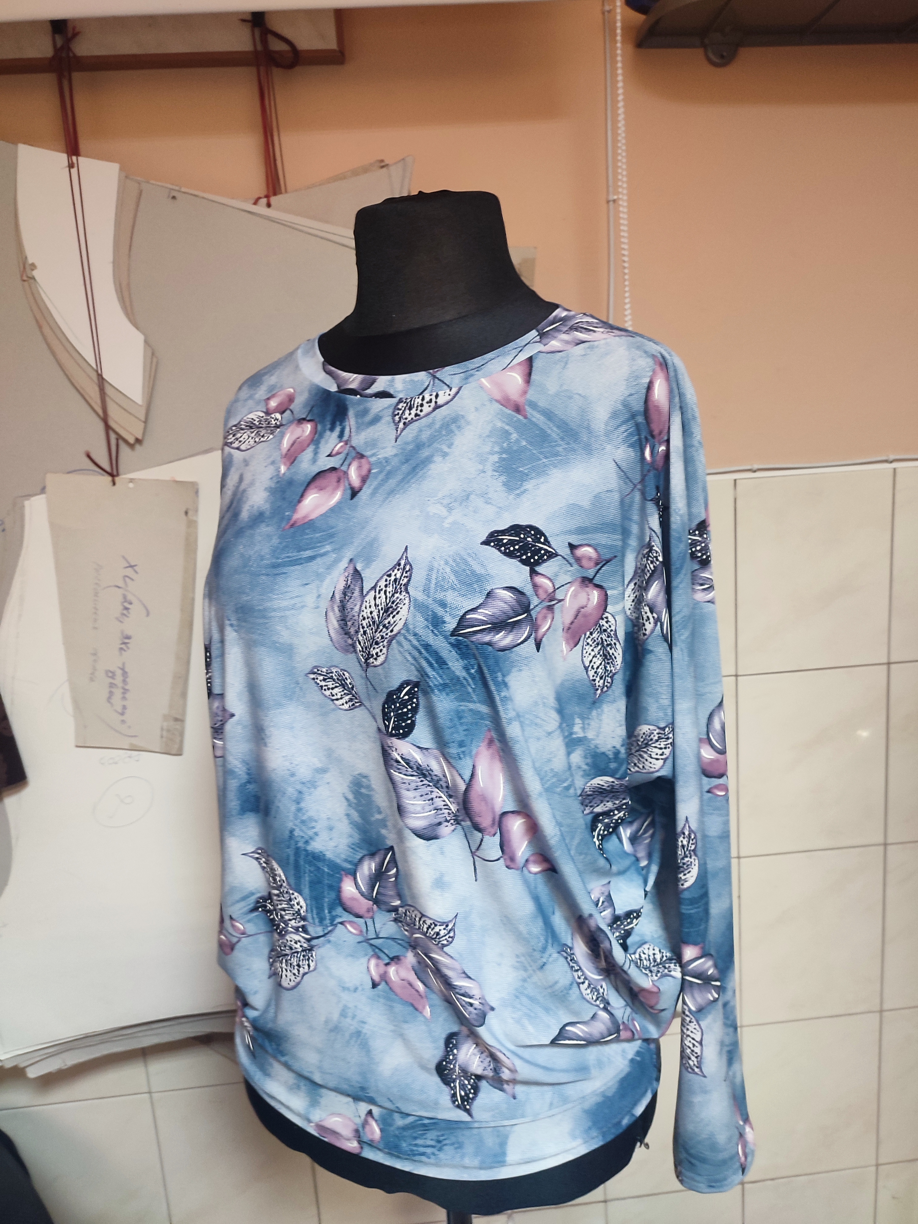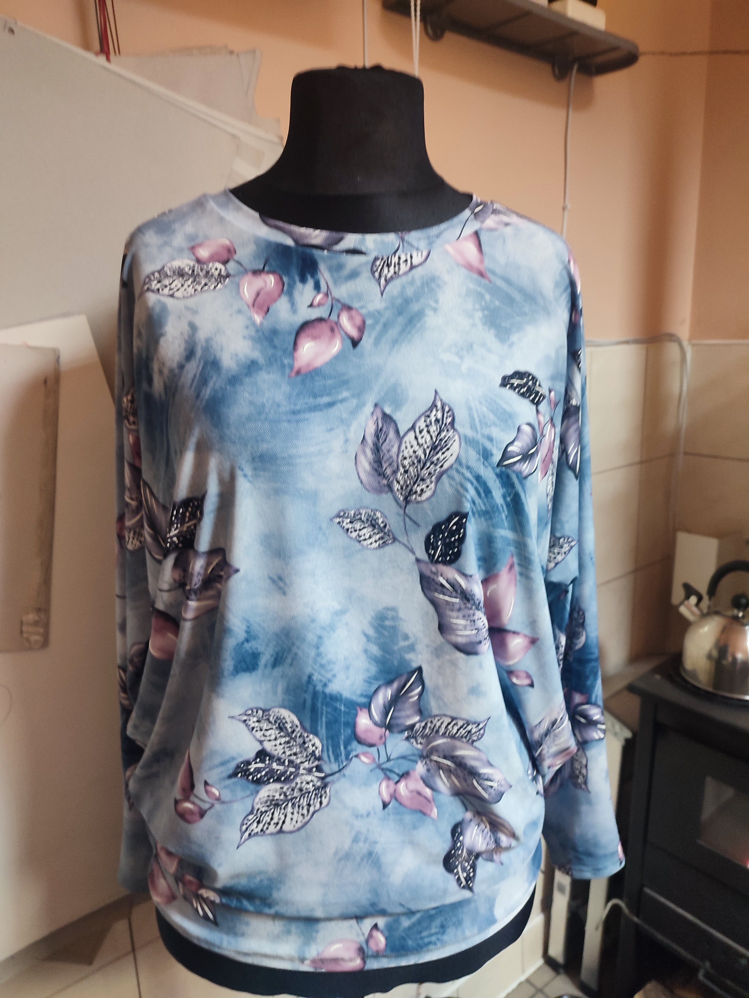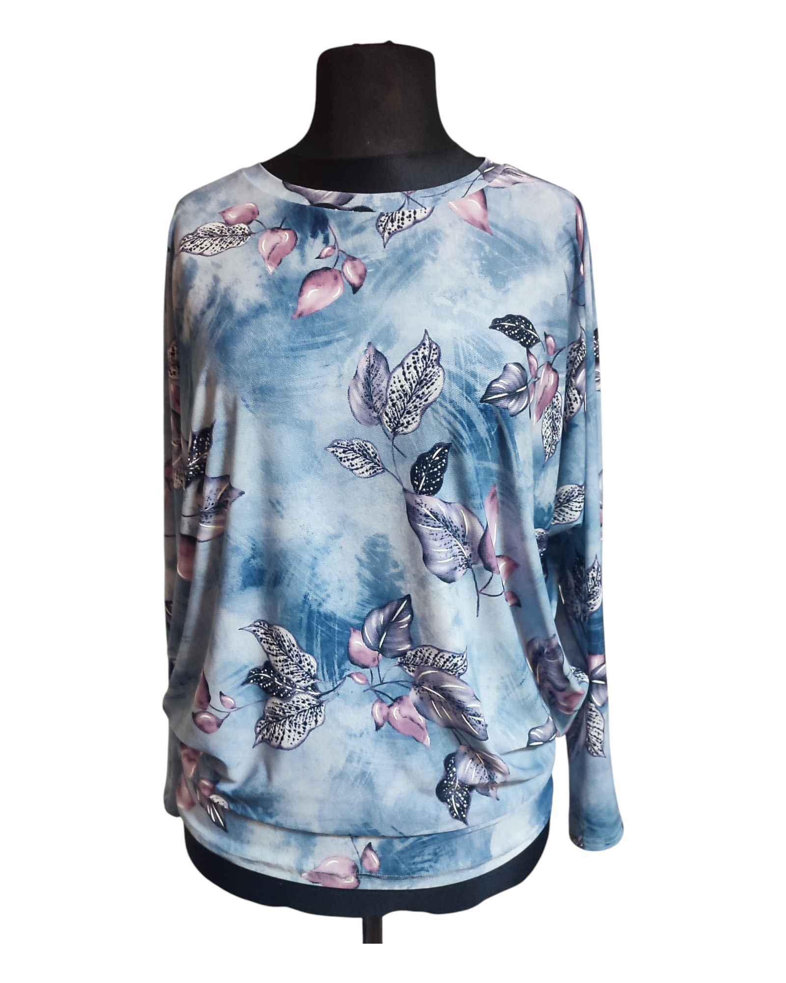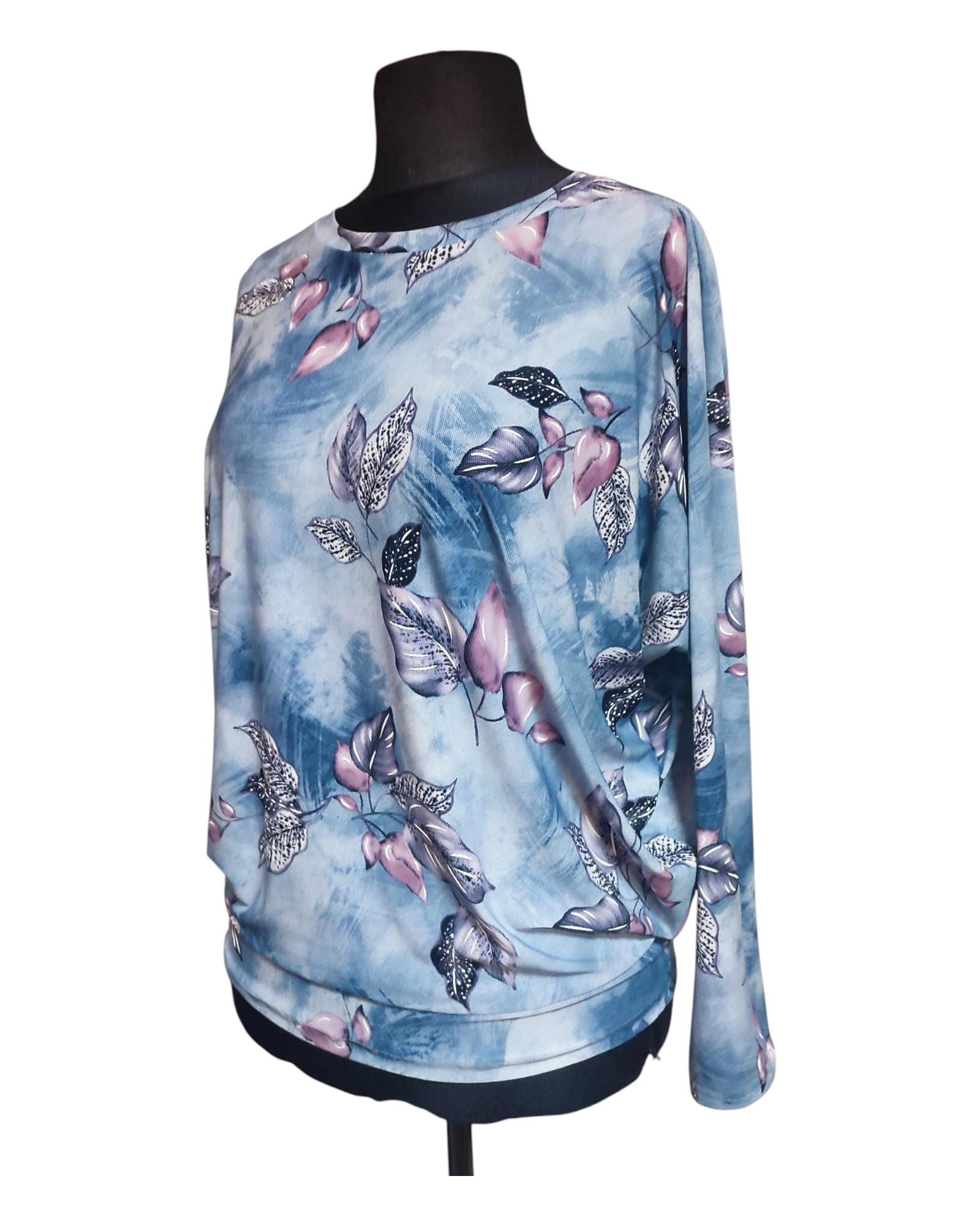 Materiał z którego uszyta jest bluzeczka to delikatny jersey poliestrowy - lekki, cienki, lejący oraz mocno elastyczny ponieważ rozciąga się zarówno po długości jak i po szerokości. Niespotykany wzór w listeczki smagane wiatrem oraz pastelowe kolory dodają lekkości tej kreacji. Gdy za oknem jest szaruga jesienna lub zimowa zawieja i pada śnieg, w naszych mieszkaniach jest gorąco więc warto ubierać lżejsze rzeczy w których nie spocisz się jak w swetrze.